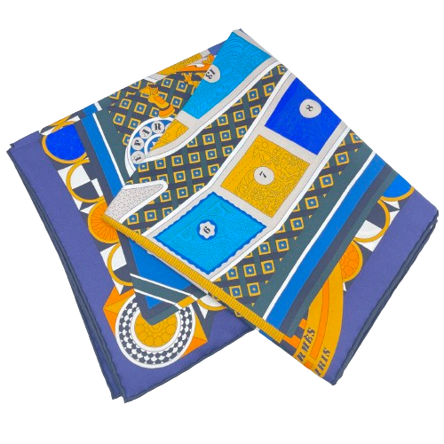 Pre-Owned Hermes Carre 90 Le Tour du Monde en 63 Cases marine/orange/bleu Scarf Silk