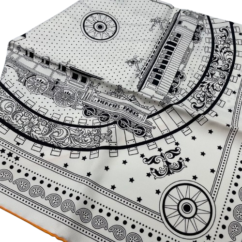 Pre-Owned Hermes Carre 55 ALL ABOARD! All ABOARD Blanc/Noir/Orange Silk 100%