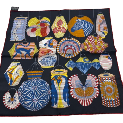 Pre-Owned Hermes Carre 45 Gavroche Lantern Balloons Hat Noir/Red 100% Silk