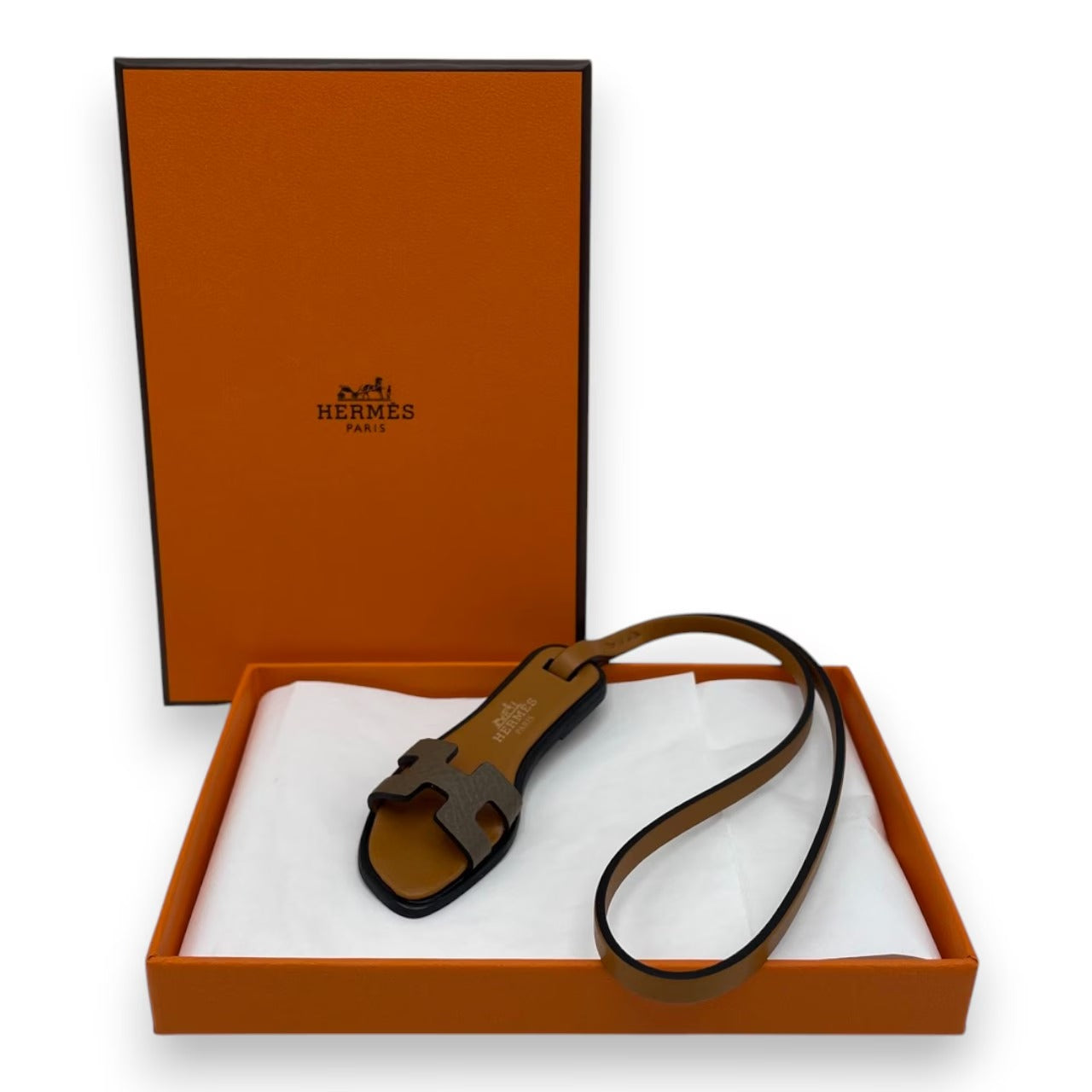 エルメスの人気サンダル「オラン」をそのままミニチュアにしたオランチャームは、ひと目でエルメスとわかるアイコニックなデザインが魅力です。シックなエトゥープ(グレー/ブラウン系)カラーは、どんなバッグや小物とも相性が良く、大人の女性のスタイルにさりげないラグジュアリー感をプラスしてくれます。バッグチャームとしてはもちろん、アクセサリー感覚で日常使いできる、ギフトにも大変人気の高いお品物です。