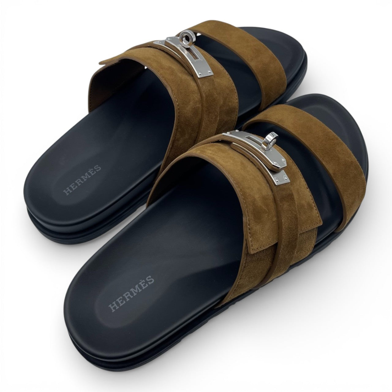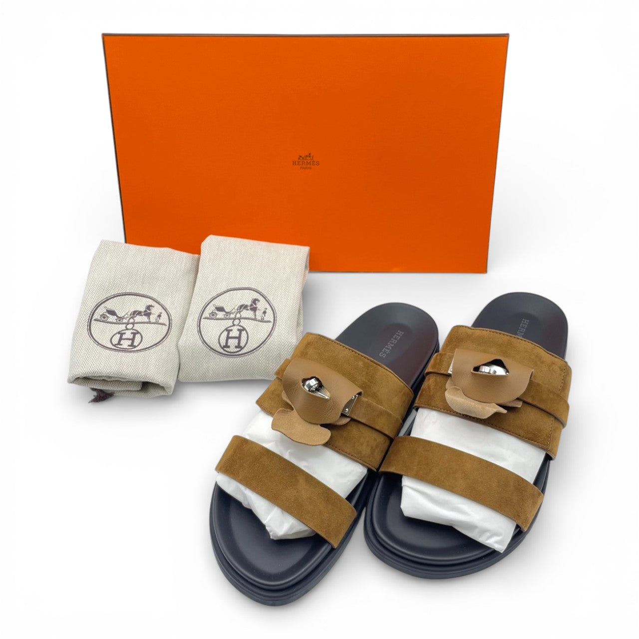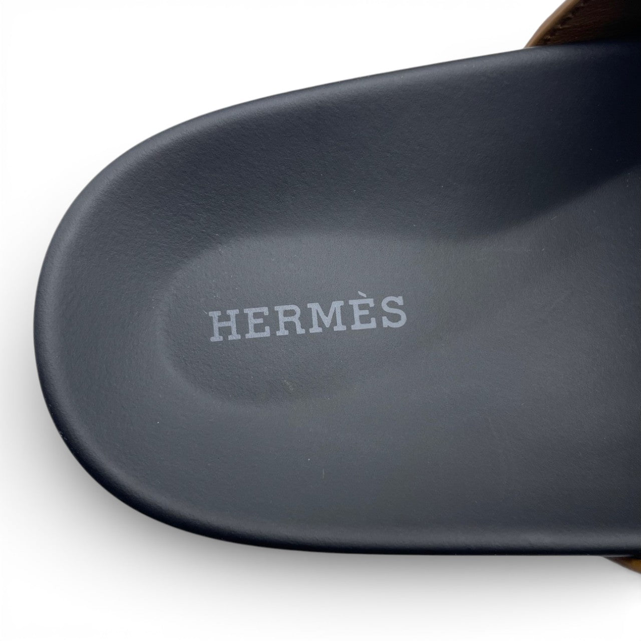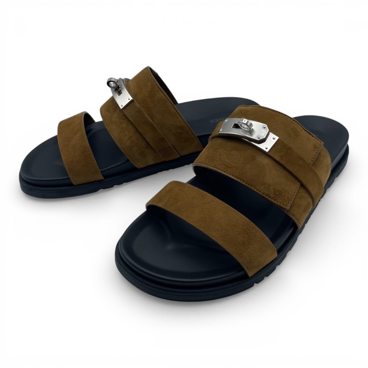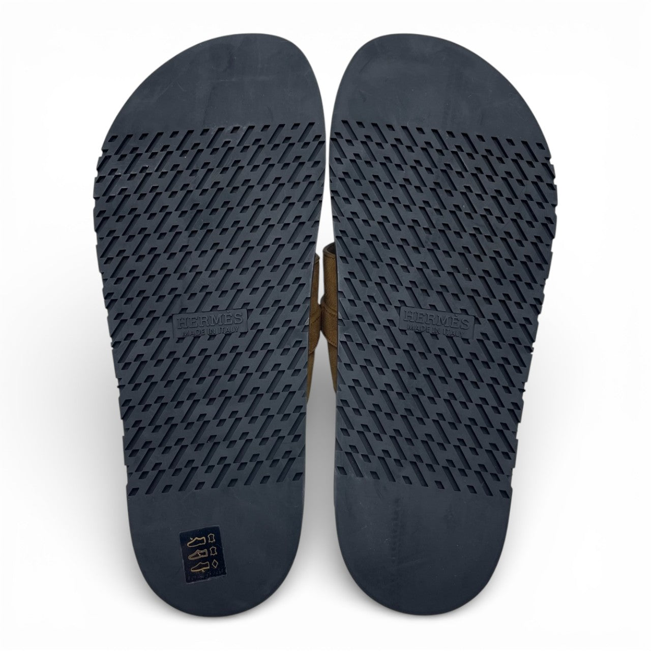 エルメスならではの上質なシェーブルとヴェロア素材を組み合わせた「ジャクソン」サンダル。深みのあるブラウン・フュメが、肌なじみの良さと洗練された印象を両立し、素足にはもちろんソックス合わせでもスタイルを格上げしてくれます。カジュアルなデニムからリゾートワンピース、ジャケットスタイルまで幅広くマッチし、男女問わずコーディネートに抜け感とラグジュアリーさをプラス。ワンランク上の休日スタイルをお楽しみいただける一足です。