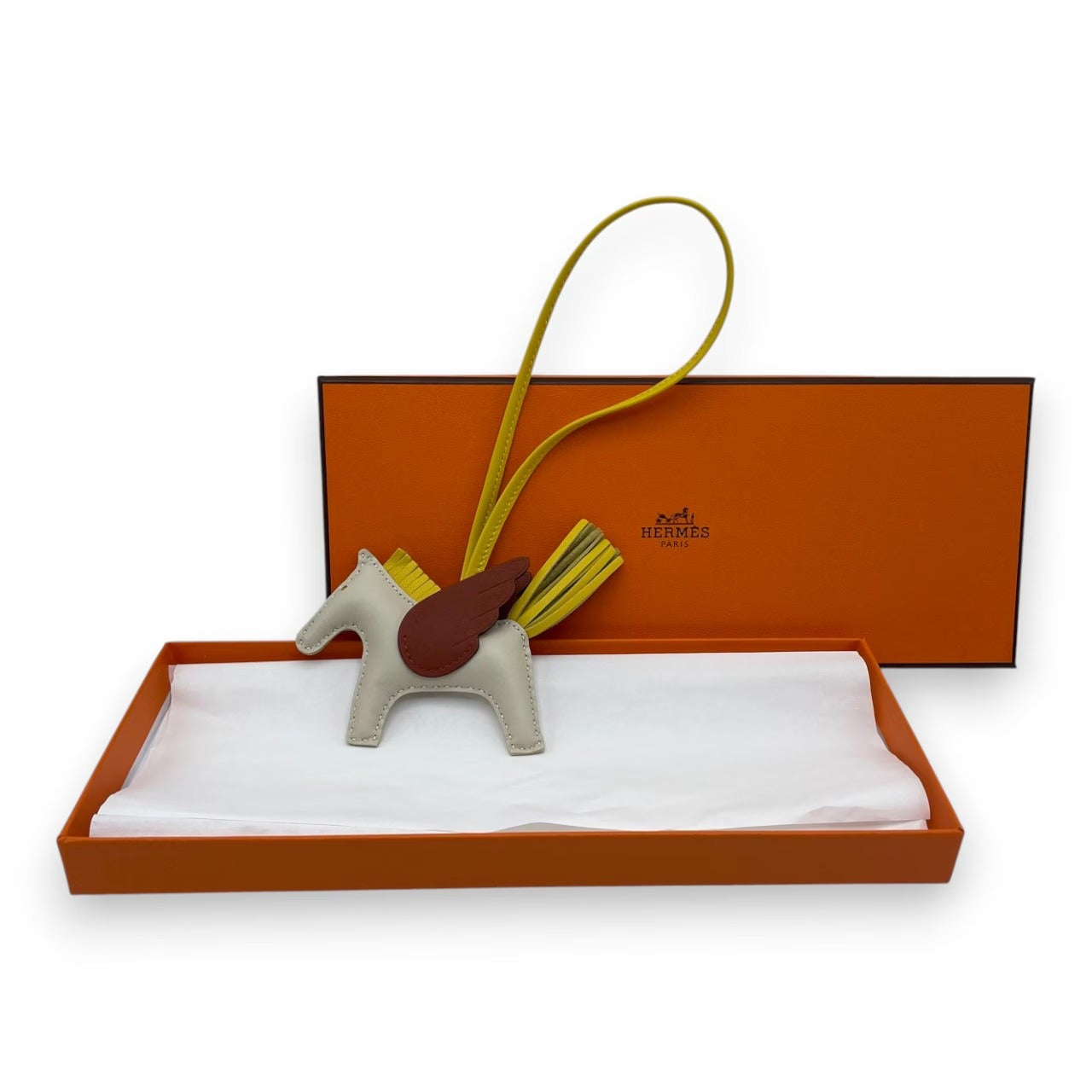 エルメスならではの上質なペガサスチャームです。やわらかく吸い付くような手触りは、触れるたびに高揚感をもたらしてくれます。クレ×ジョーヌナプル×キュイーブルの洗練された配色は、スタイリングに上品な彩りをプラス。バッグの邪魔をしないPMサイズで、チャーム自体も存在感を放つ一点です。ご自身用にはもちろん、特別な方へのギフトにも最適な逸品です。