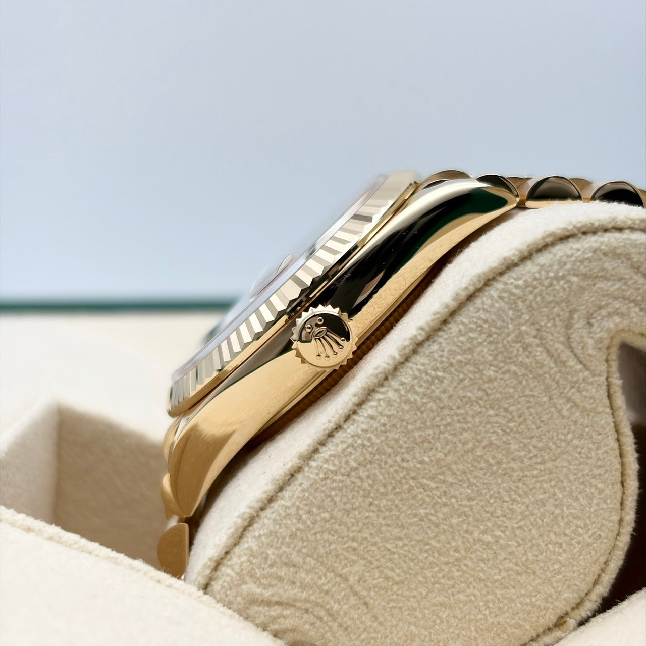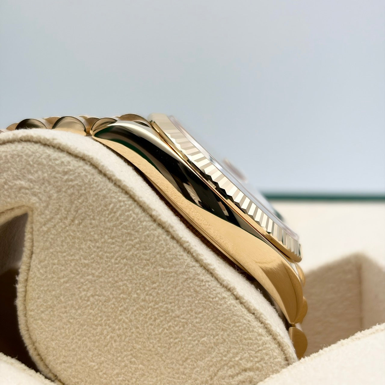This is a Rolex flagship Day-Date watch with a rare carnelian dial. The deep orange-red color enhances the shine of the yellow gold case and bracelet, giving it a rich presence on your wrist. This is a Rolex that will last a lifetime, combining the practicality of a date and day of the week display with the elegance of a piece of jewelry.
