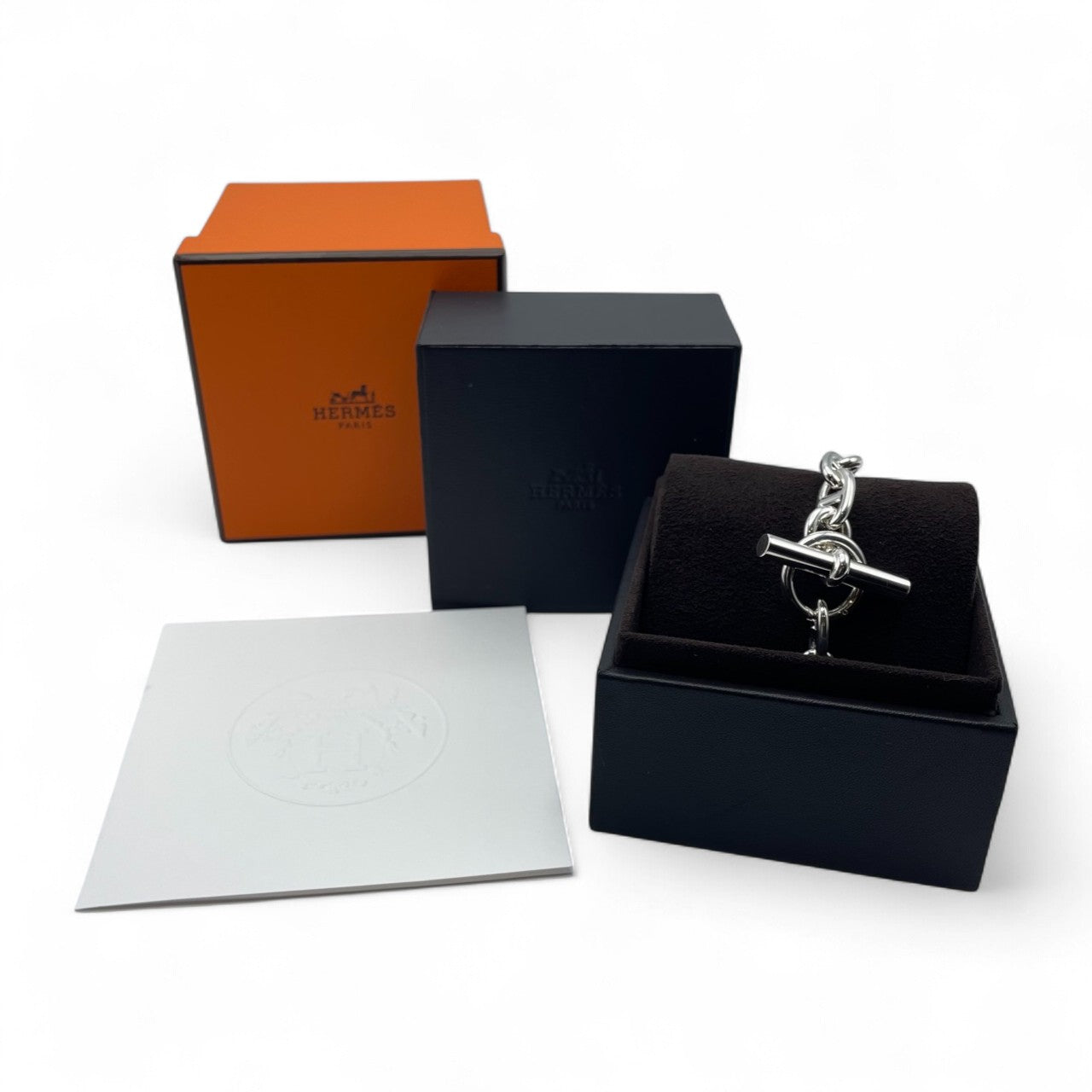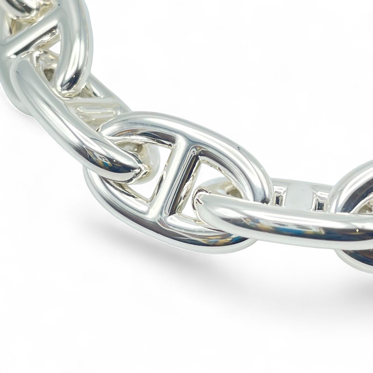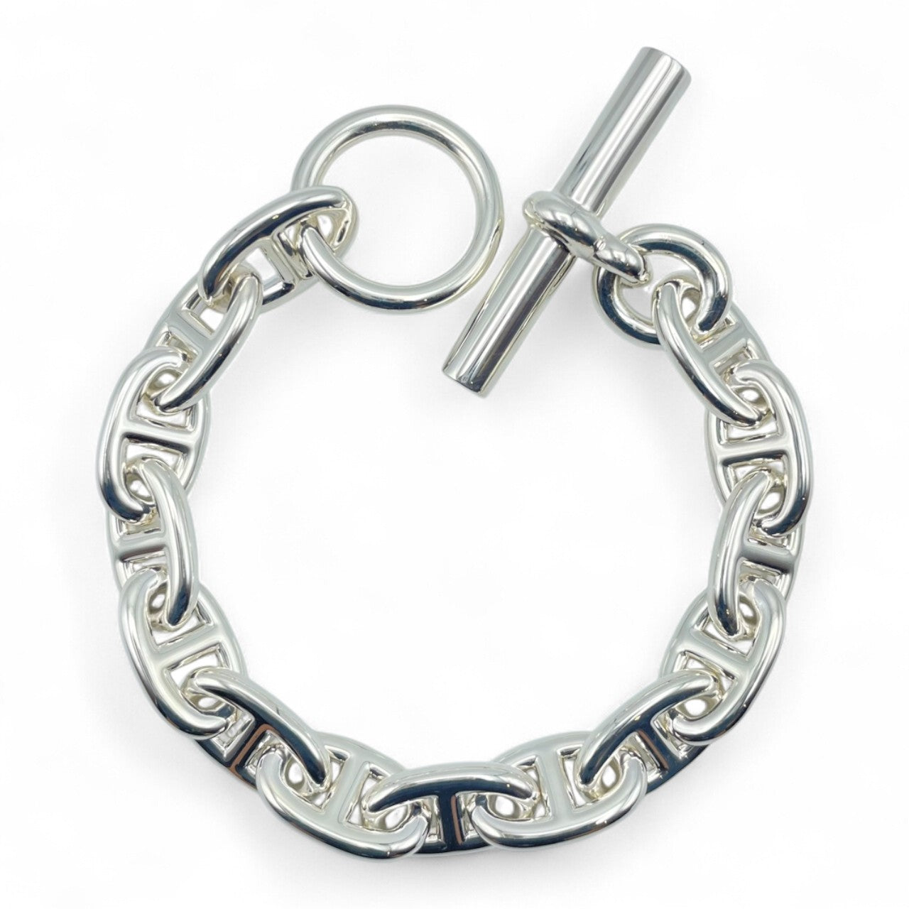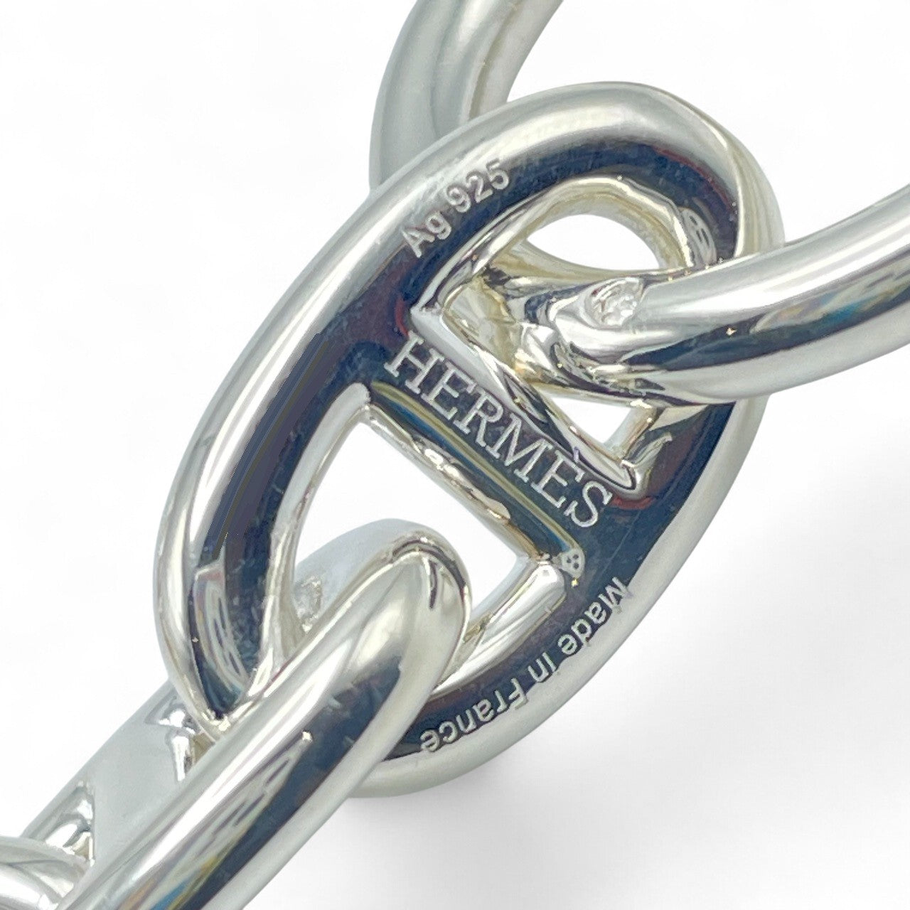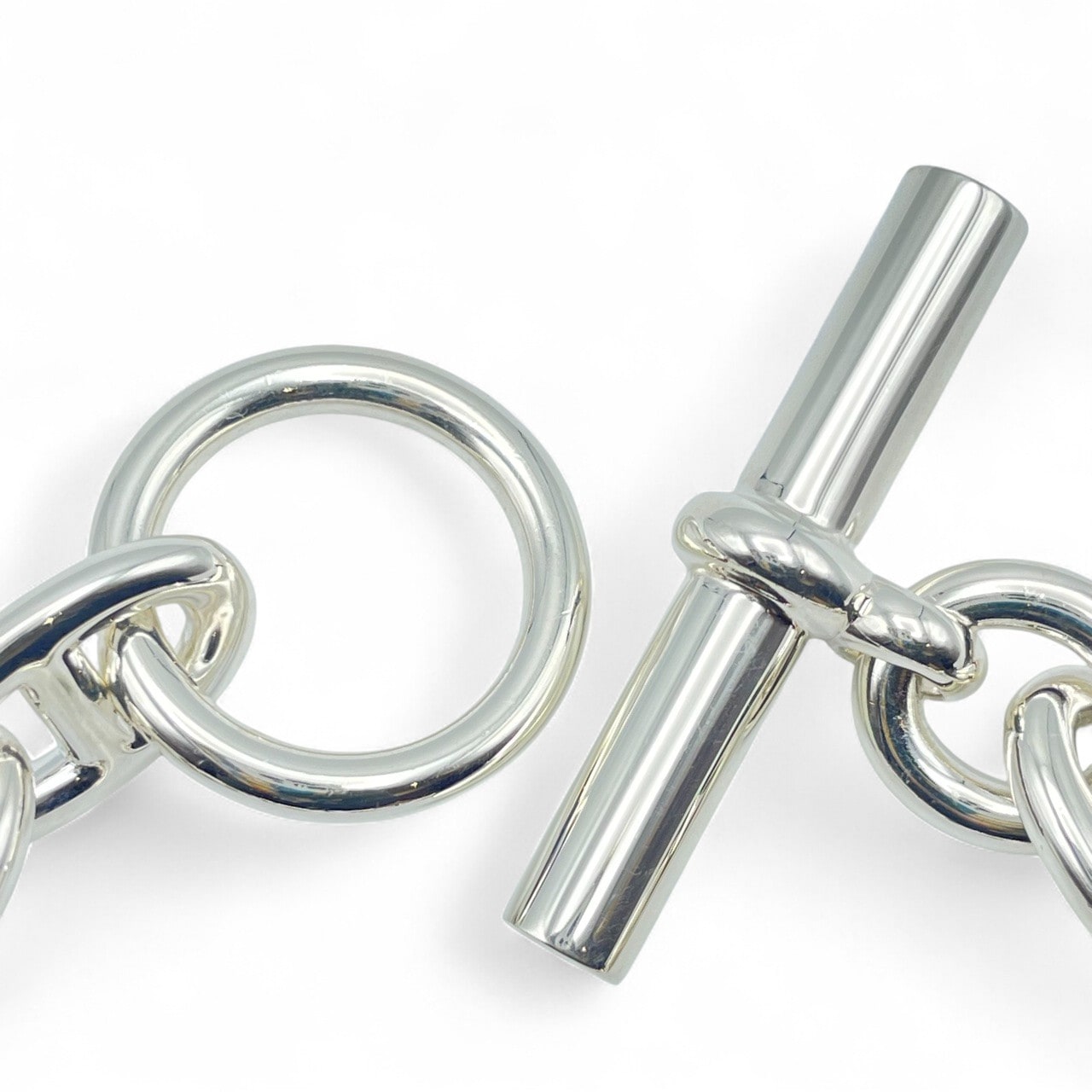 エルメスのシェーヌダンクルは、その独自のデザインと高級感で多くのファッション愛好者から絶大なる支持を得ています。シルバー素材で統一されたこのジュエリーは、14コマのチェーンがエレガントに連なり、手元に優雅さをプラスします。シンプルながらも洗練されたデザインは、どんなスタイルにもマッチし、さりげない存在感を放ちます。飽きのこないデザインは、年齢や服装を問わず、永くご愛用いただける一品です。流行を超えた価値を感じさせてくれる、特別な日を彩るにふさわしいジュエリーです。