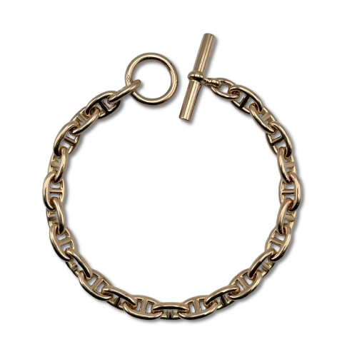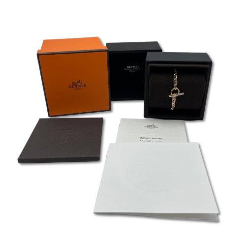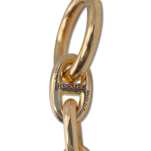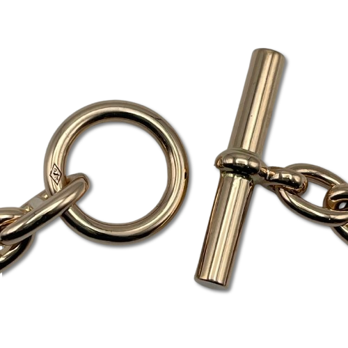 エルメスのシェーヌ・ダンクル ブレスレットは、洗練されたデザインとエレガントなローズゴールドの輝きが特徴です。手首に添えるだけで、華やかさと気品を同時に与えるアイテムで、日常使いから特別な場面まで幅広く活躍します。TPMサイズの24コマで設計されたこのブレスレットは、エルメスならではの上質な素材と卓越したクラフトマンシップを堪能できる逸品です。他のジュエリーとの重ね付けも楽しめるシンプルかつスタイリッシュなデザインは、長く愛用できること間違いなしです。