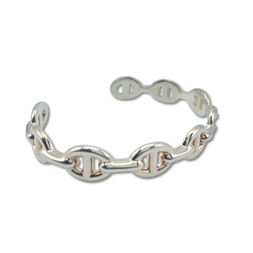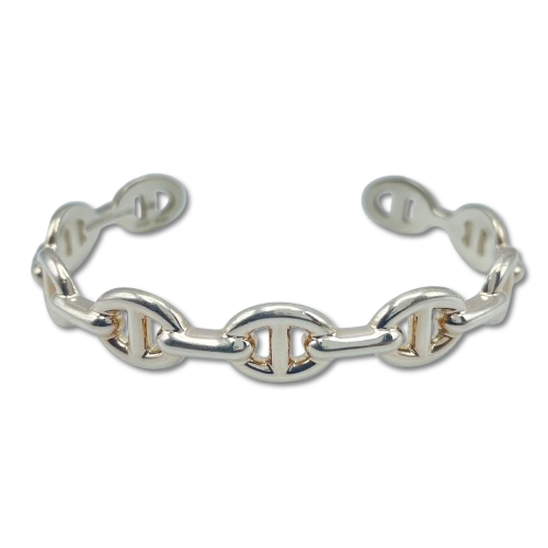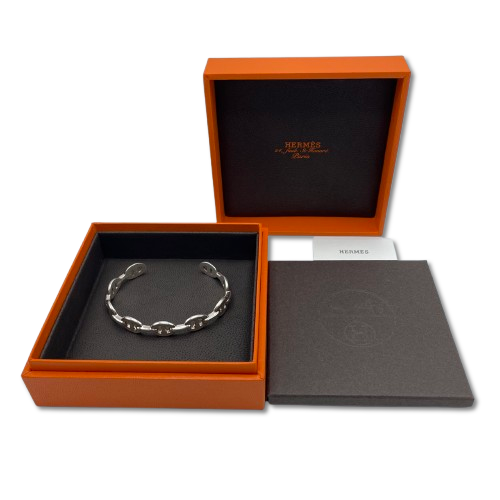 エルメスのシェーヌダンクル アンシェネMM シルバーは、シンプルかつ洗練されたデザインで、どんなスタイルにもマッチするジュエリーです。シルバー素材の美しい輝きが、手元にエレガントさをプラスし、普段のコーディネートをワンランク上に仕上げます。LGサイズは程よい存在感があり、エルメスならではの優雅な雰囲気を漂わせます。大切な方へのプレゼントや自分へのご褒美として、長く愛用していただける逸品です。