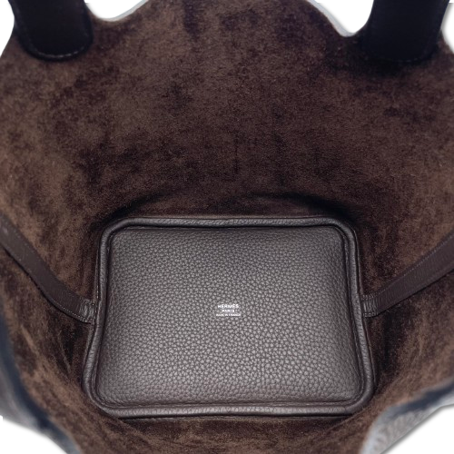 Hermes' Picotan Lock is loved by many women for its simple and elegant design. Ebenne color is a deep and elegant color that matches any style. Taurillon Clemence material is soft and durable, making it ideal for everyday use. Size PM is just the right size and is both easy to carry and easy to use. By owning this bag, you can add a sense of luxury and sophistication to your everyday style and bring out a new charm.