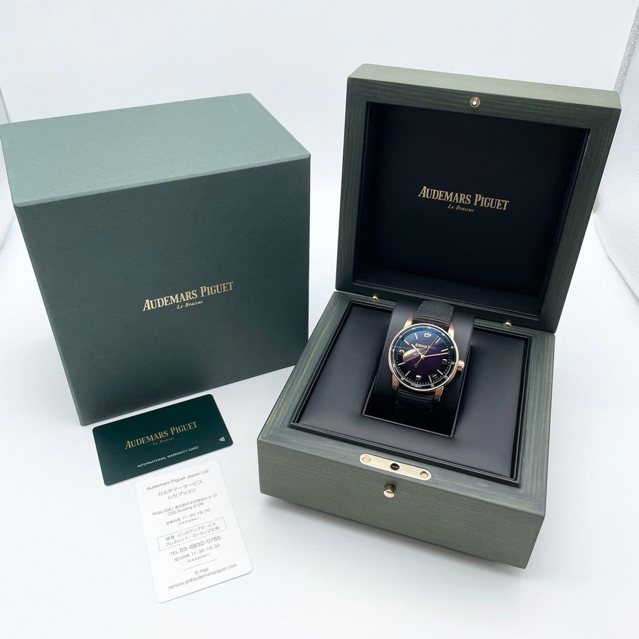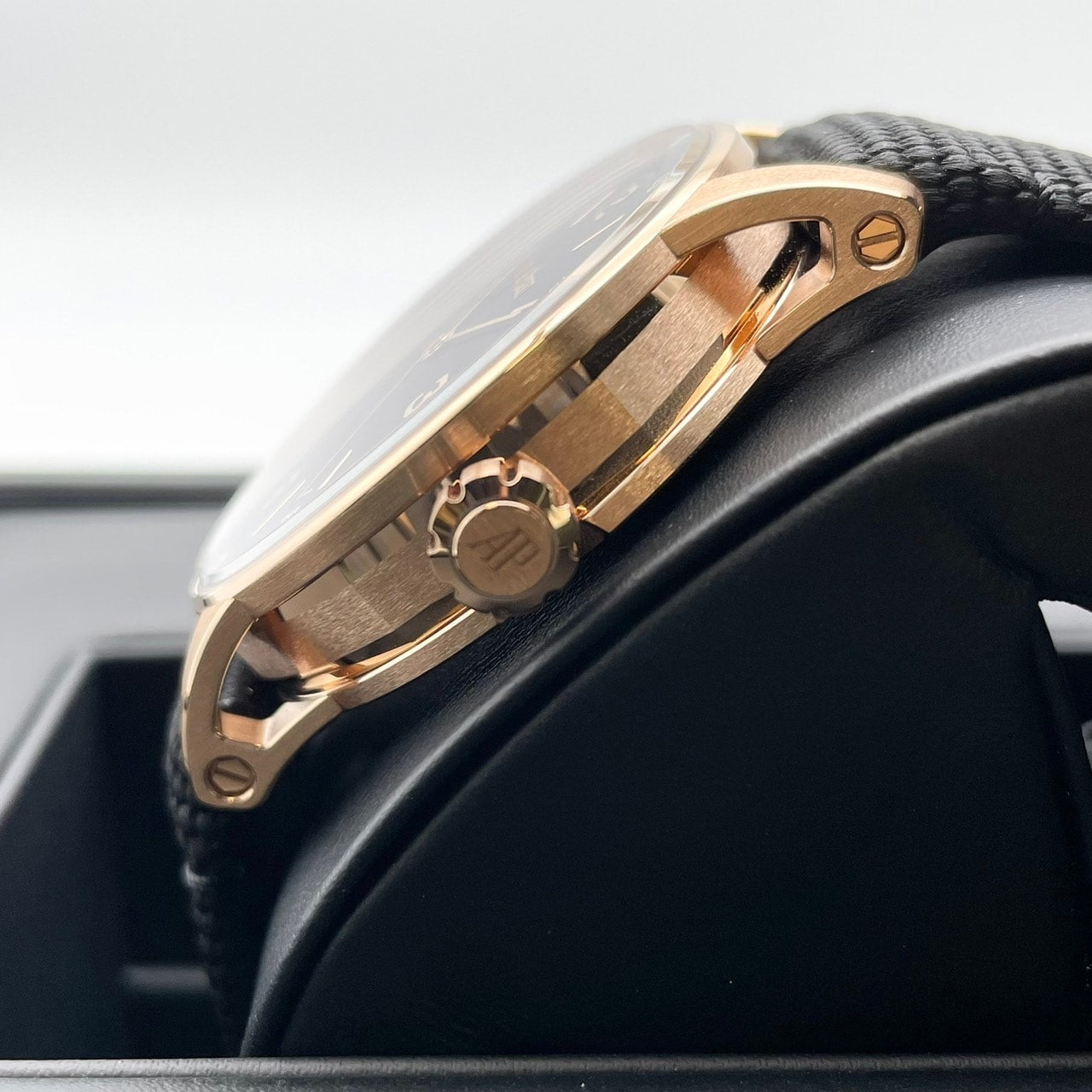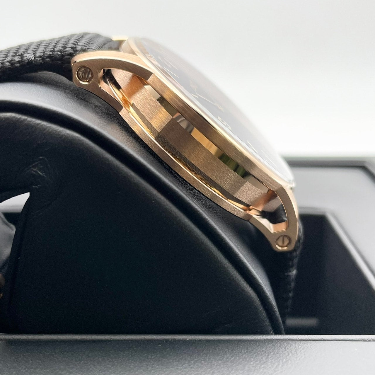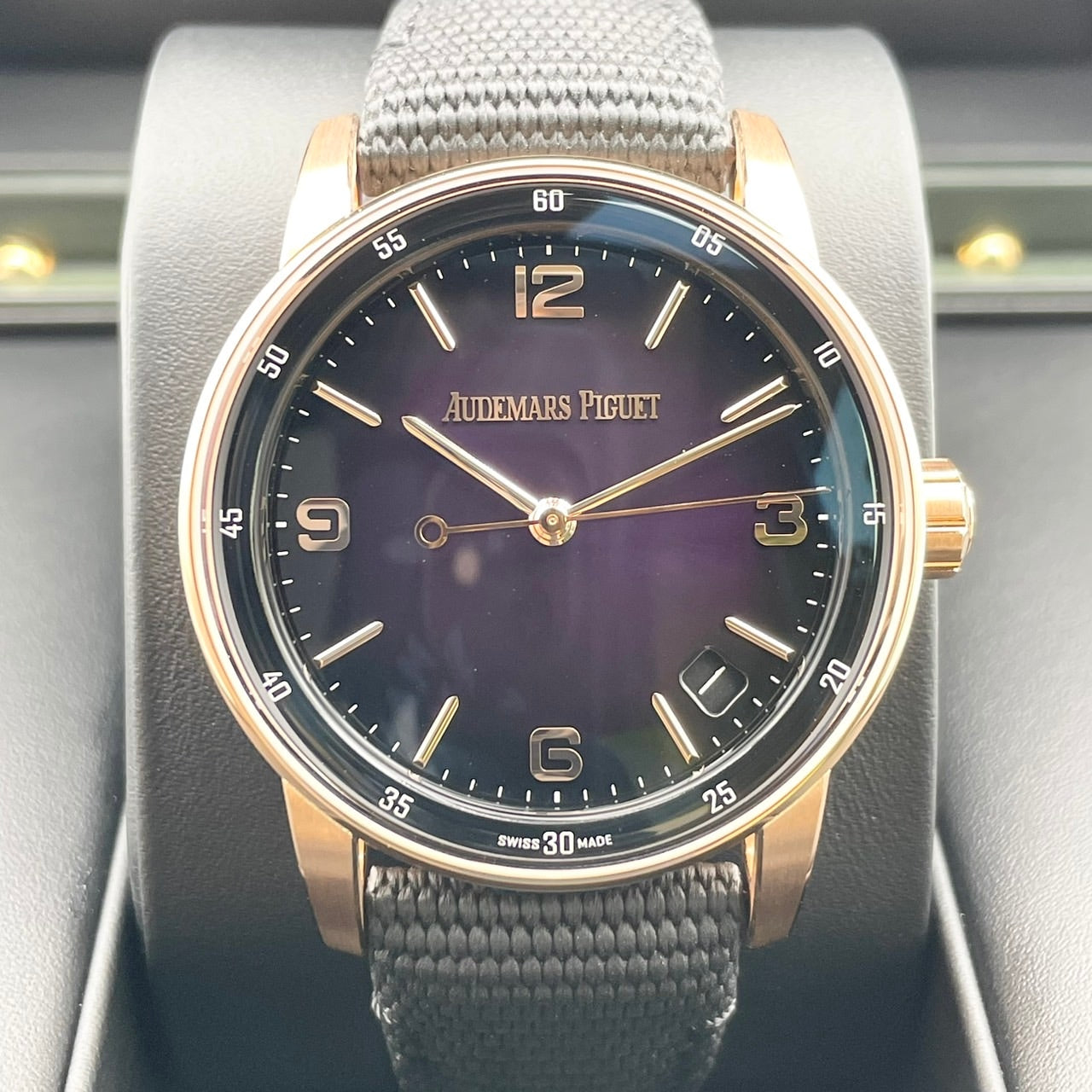 This fabric belt matches the 18K pink gold case, sunray pattern smoke cracker dial, and deep color of the dial.