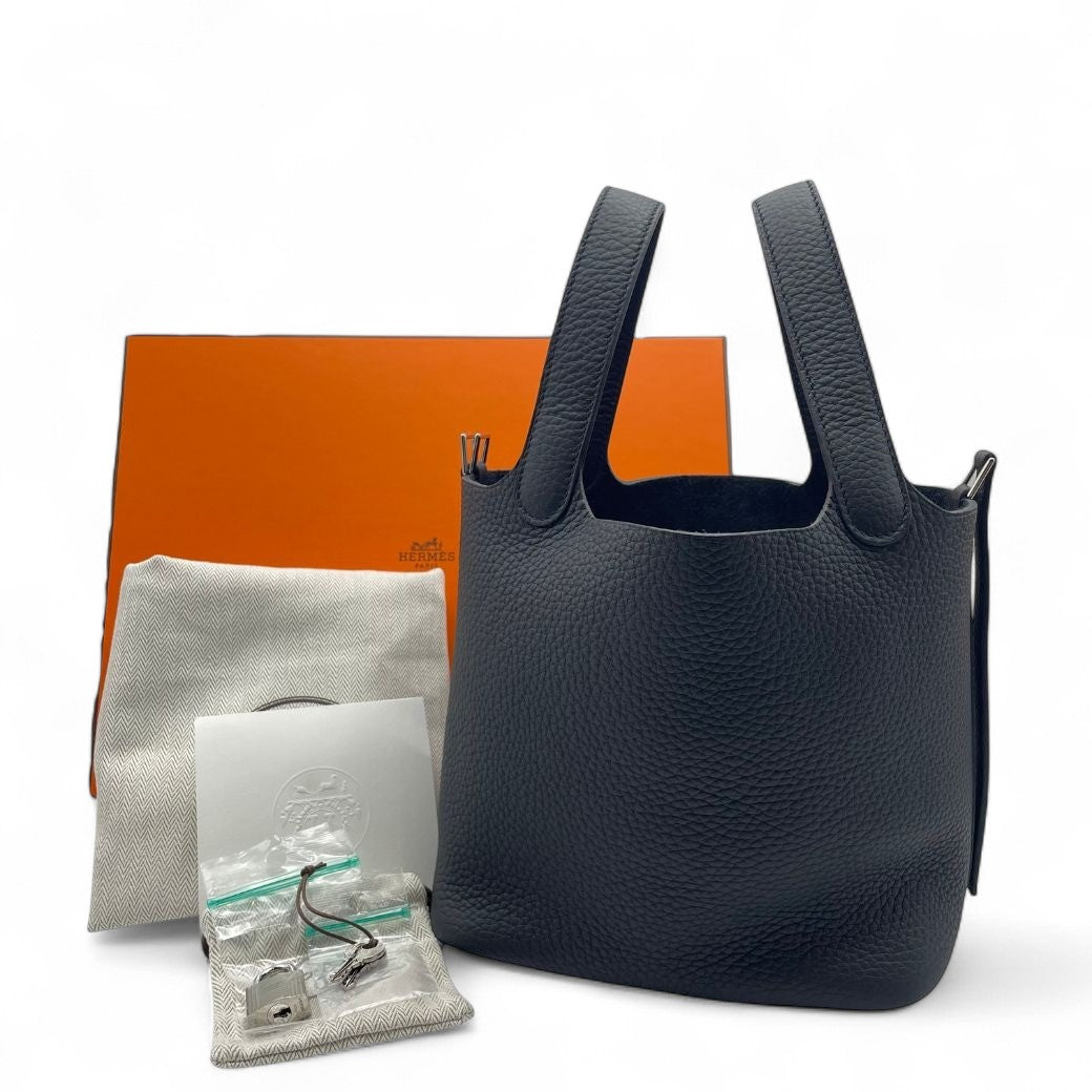 Hermes' Picotin Rock is a simple yet sophisticated design that has been popular with many fashion enthusiasts. This noir-colored bag is versatile and can be used in a wide range of situations, from everyday use to formal occasions. Made from Torillon Clemence material, it is soft and durable. The elegant black color matches any outfit and will enhance the elegance of the person who holds it. This size PM is just right, and combines practicality and style.
