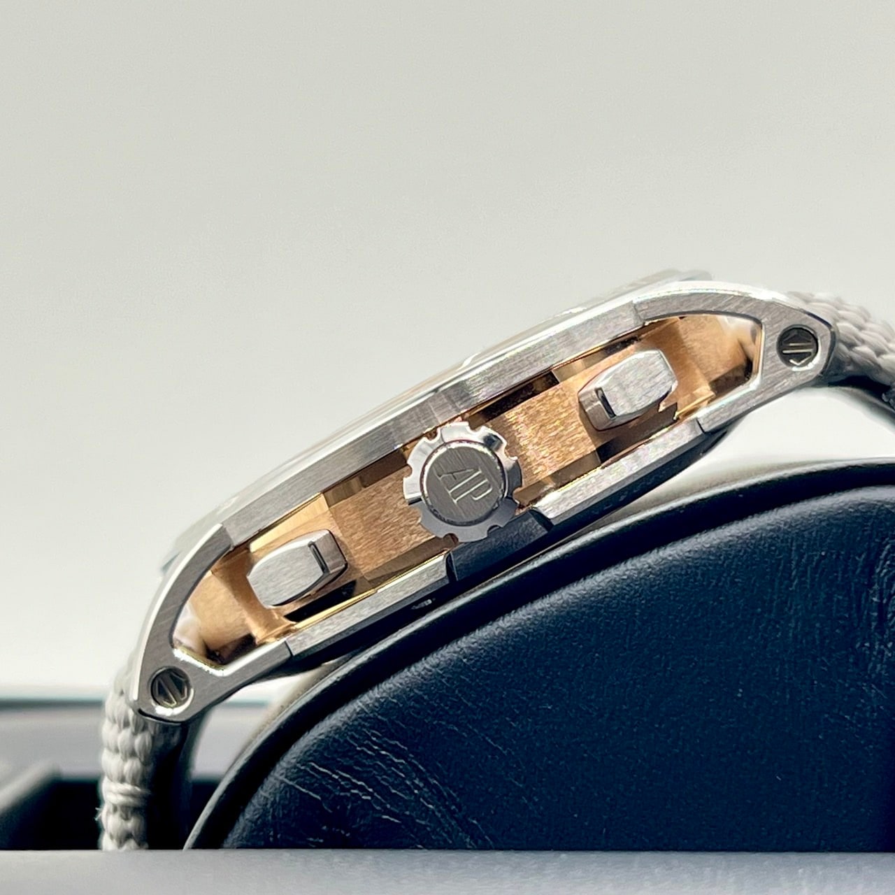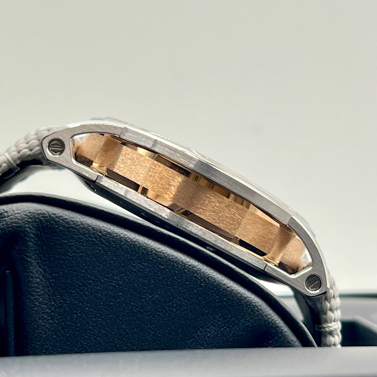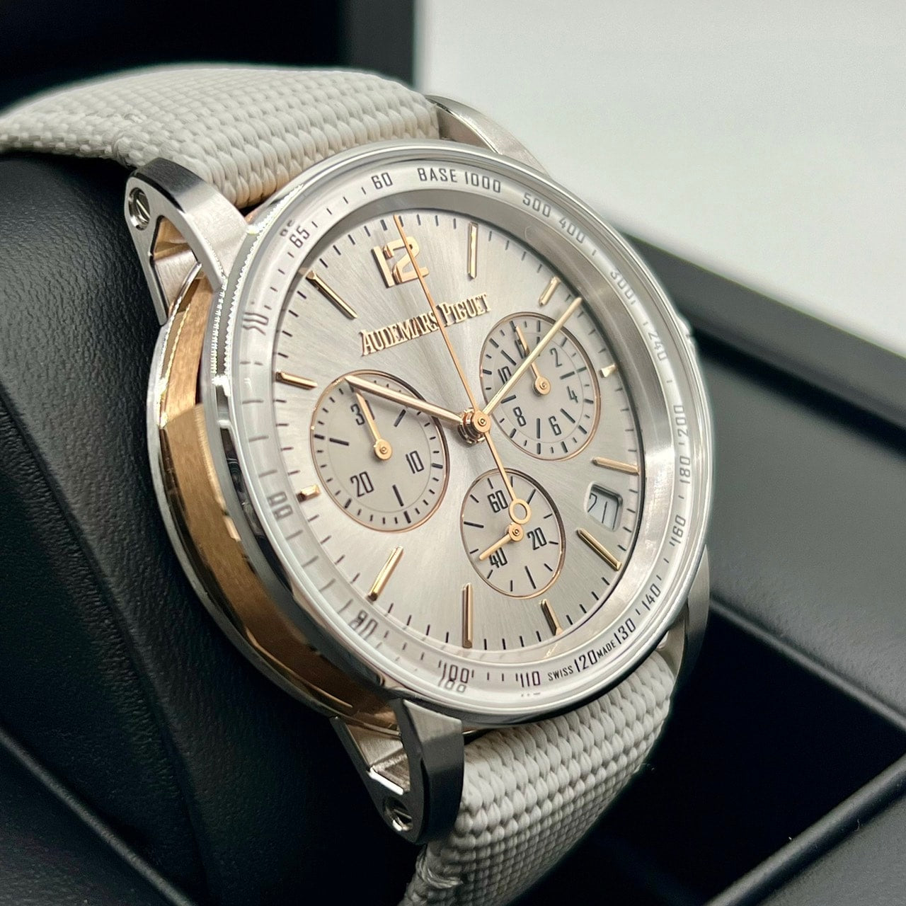 A case made from a combination of 18K white gold and pink gold, and a Sunburst gray lacquer dial.