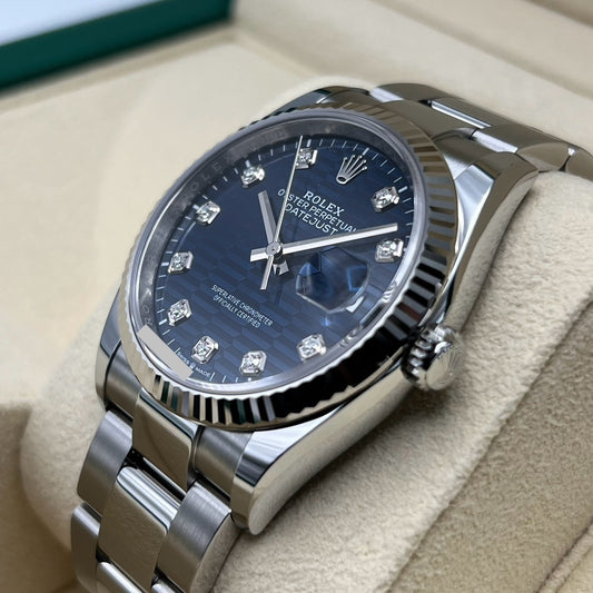 사전 소유 롤렉스 데이트 주목 126234G 밝은 파란색 스테인레스 스틸 + 화이트 골드 굴 팔찌 36mm