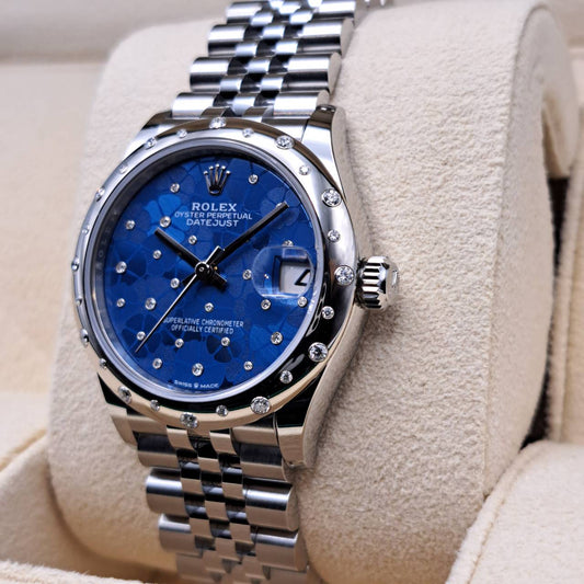사전 소유의 롤렉스 데이트 조정 278344RBR Azzuro 블루 플로럴 모티프 다이아몬드 희년 팔찌 31mm