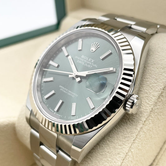 사전 소유의 롤렉스 데이트 주목 126334 Mint Green Oyster Bracelet 41mm
