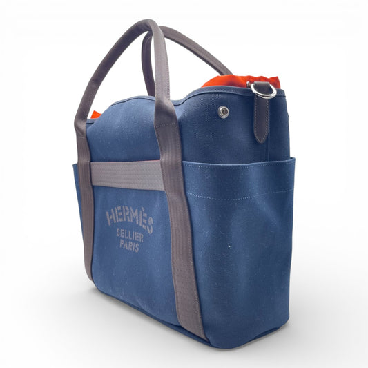 중고 Hermes Sacked Panjage 신랑 48 블루 네이비/푸 캔버스/바레니아 실버 하드웨어 K 스탬프