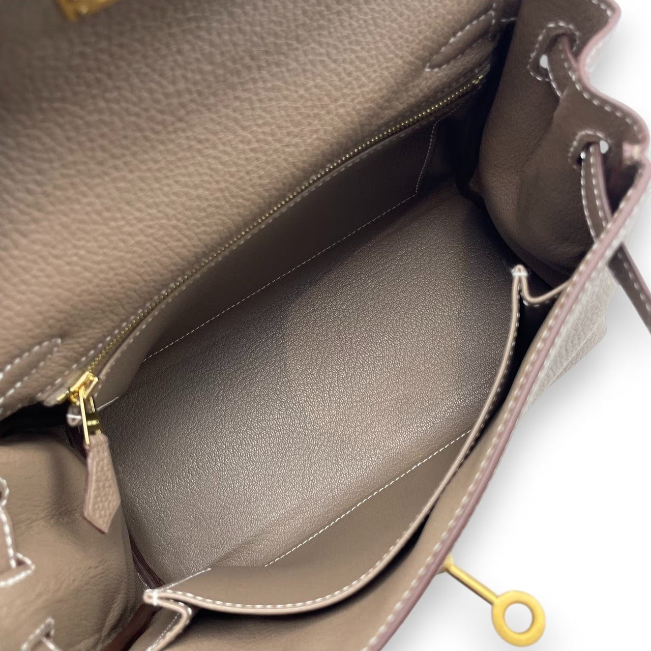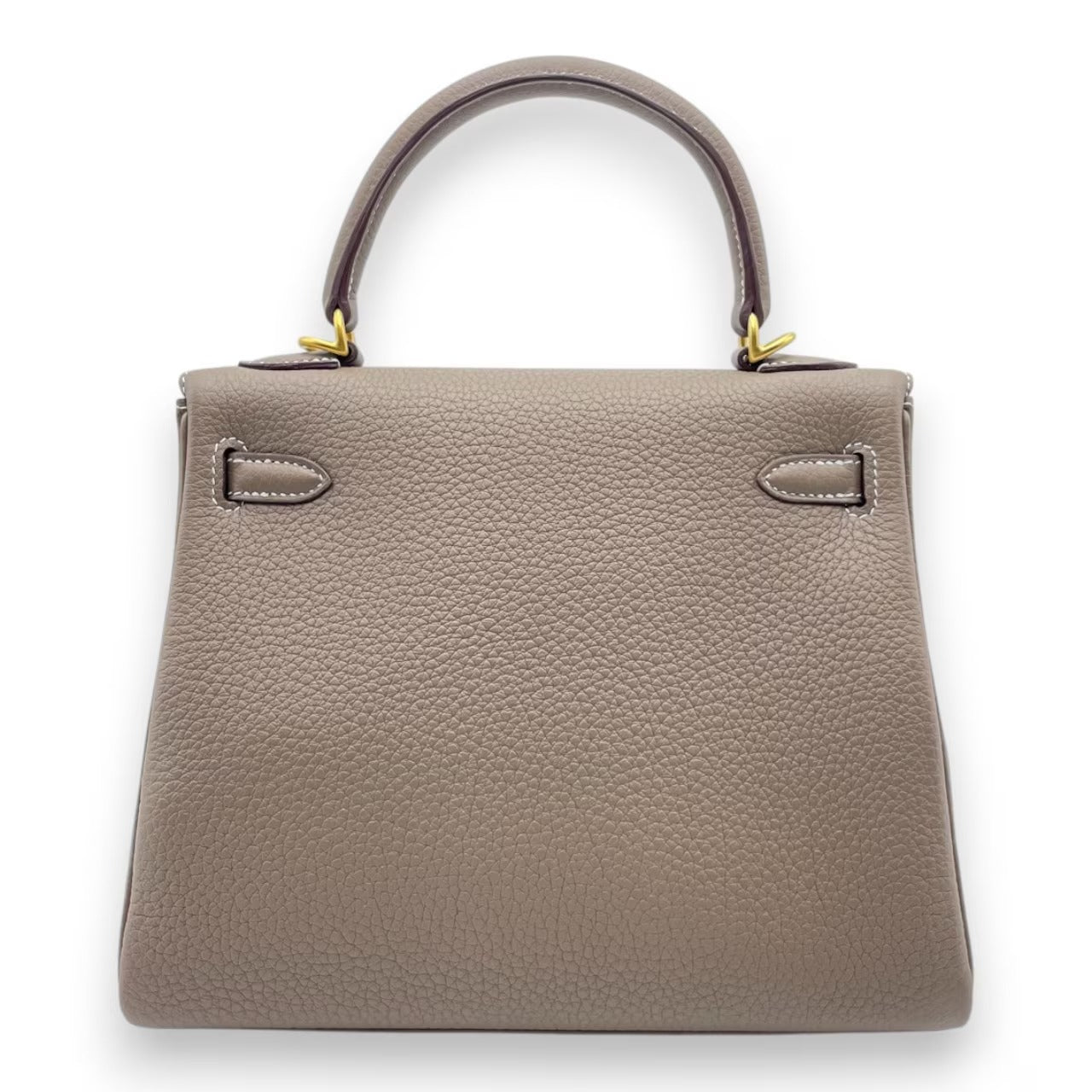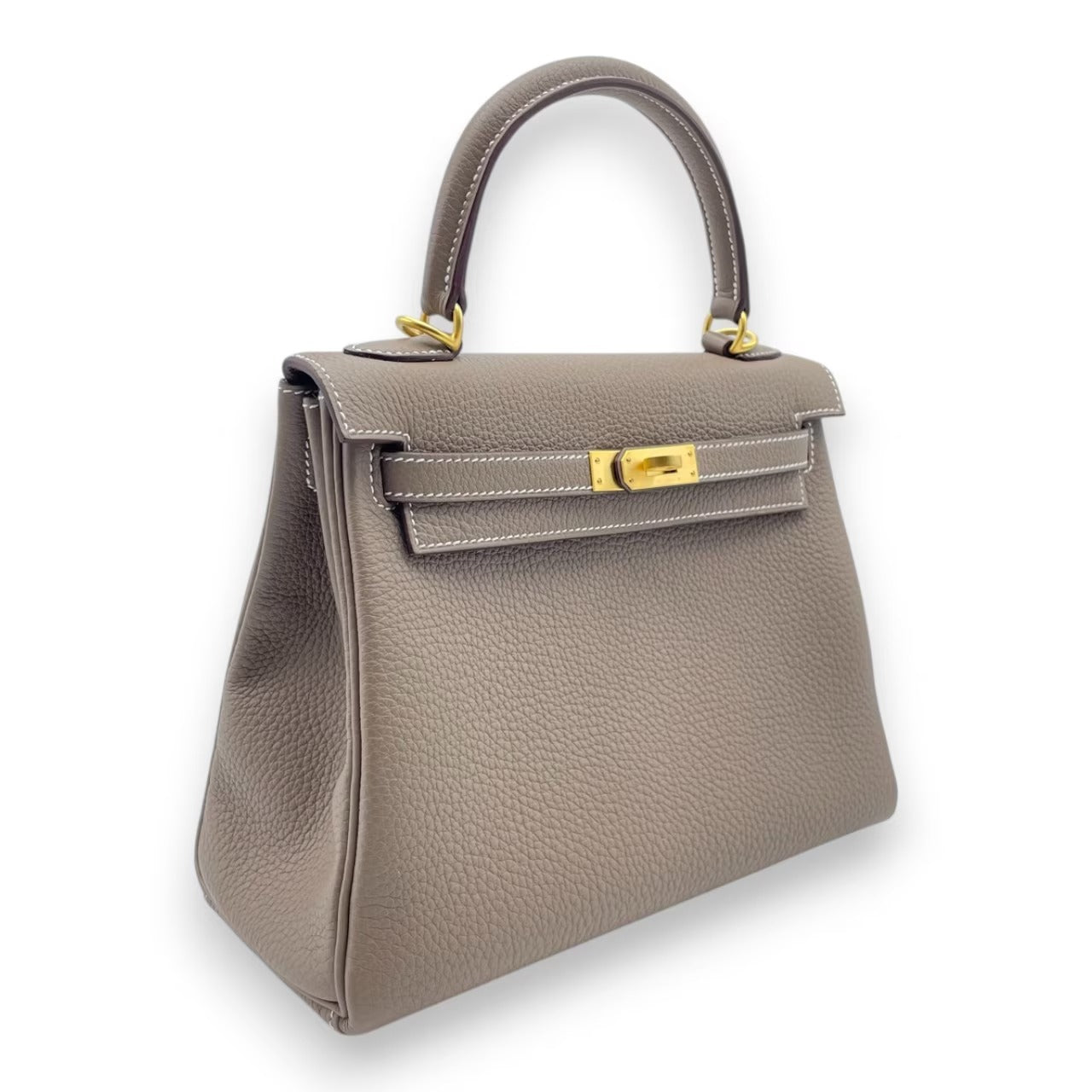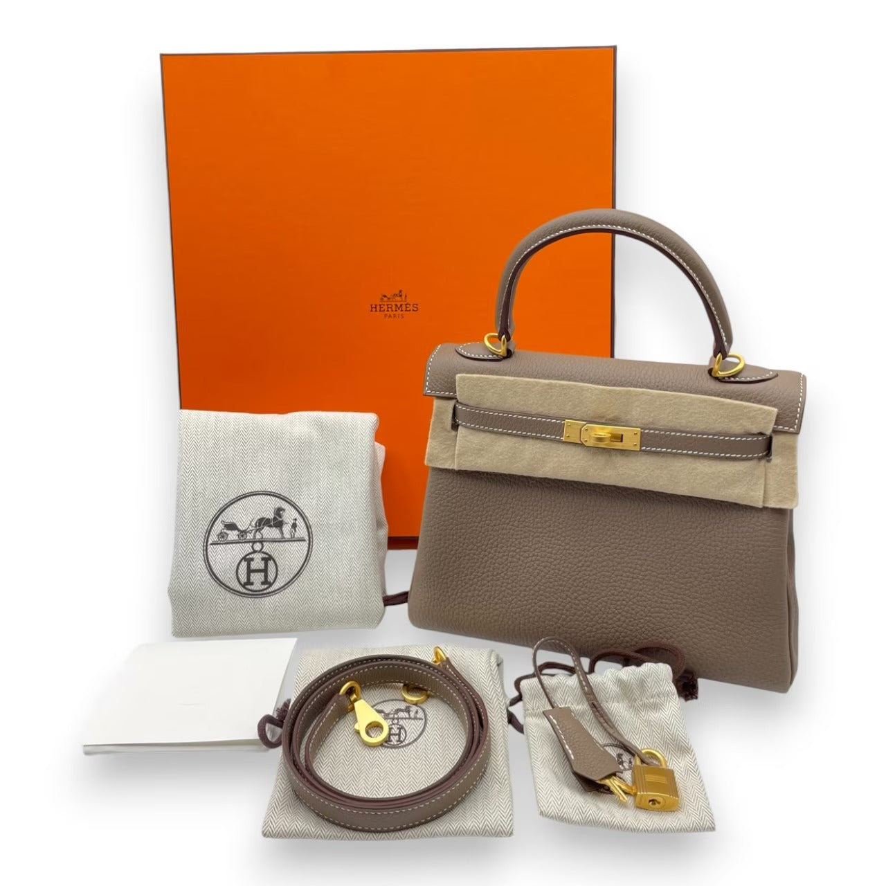 エルメス不朽の名作「ケリー」。人気のサイズ25とエトゥープの組み合わせが入荷しました。上質なトゴ素材ならではの程よいハリと傷が目立ちにくい質感は、デイリーから特別なシーンまで幅広く活躍します。グレージュ系のエトゥープは、どんな装いにも自然に溶け込みつつ、持つ人の品格をさりげなく高めてくれる万能カラー。ワンランク上のエレガンスをお求めの方に、長くご愛用いただけるタイムレスな逸品です。