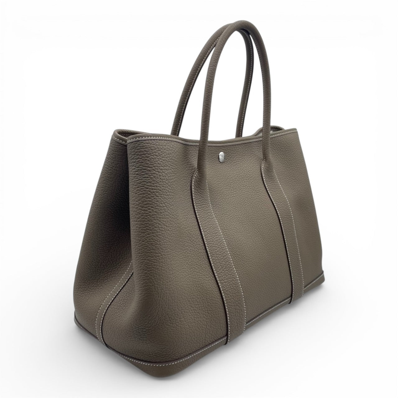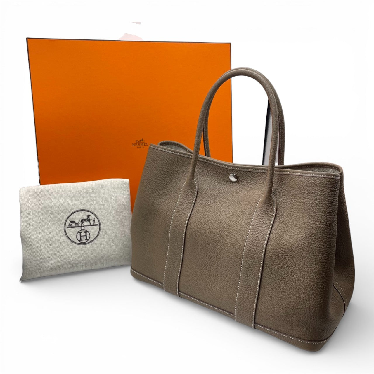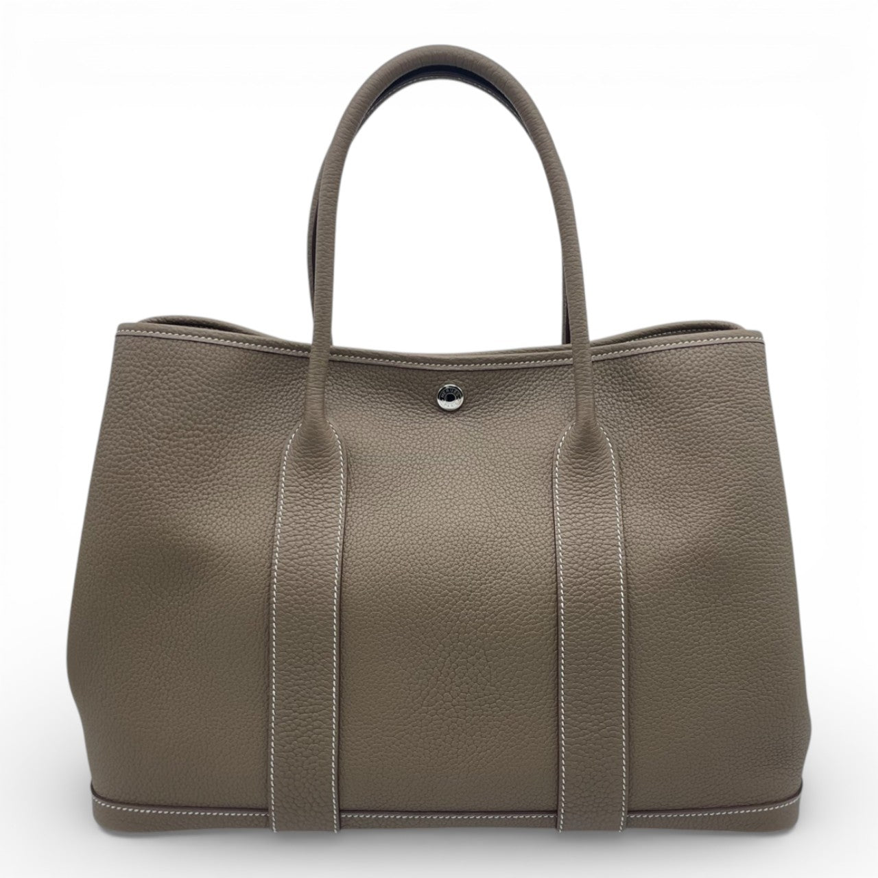 エルメスを代表するトートバッグ「ガーデンパーティー PM 36」。上質なネゴンダレザーならではのふっくらとした質感と、傷が目立ちにくい実用性を兼ね備えた、大人のデイリーバッグです。カラーはエルメスの人気色エトゥープ。グレージュのニュアンスがどんな装いにも自然と溶け込み、ビジネスから休日スタイルまで幅広く活躍します。肩掛けも手持ちも美しく決まり、初めてのエルメスにも、すでにお持ちのコレクションの一つとしてもおすすめの逸品です。