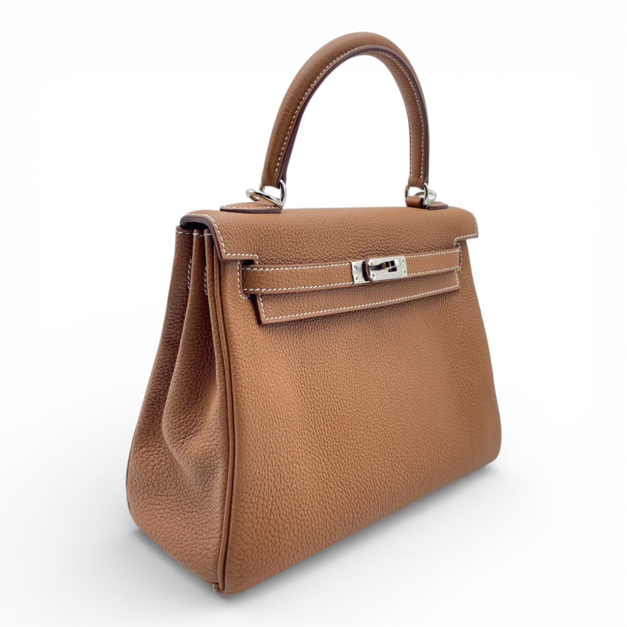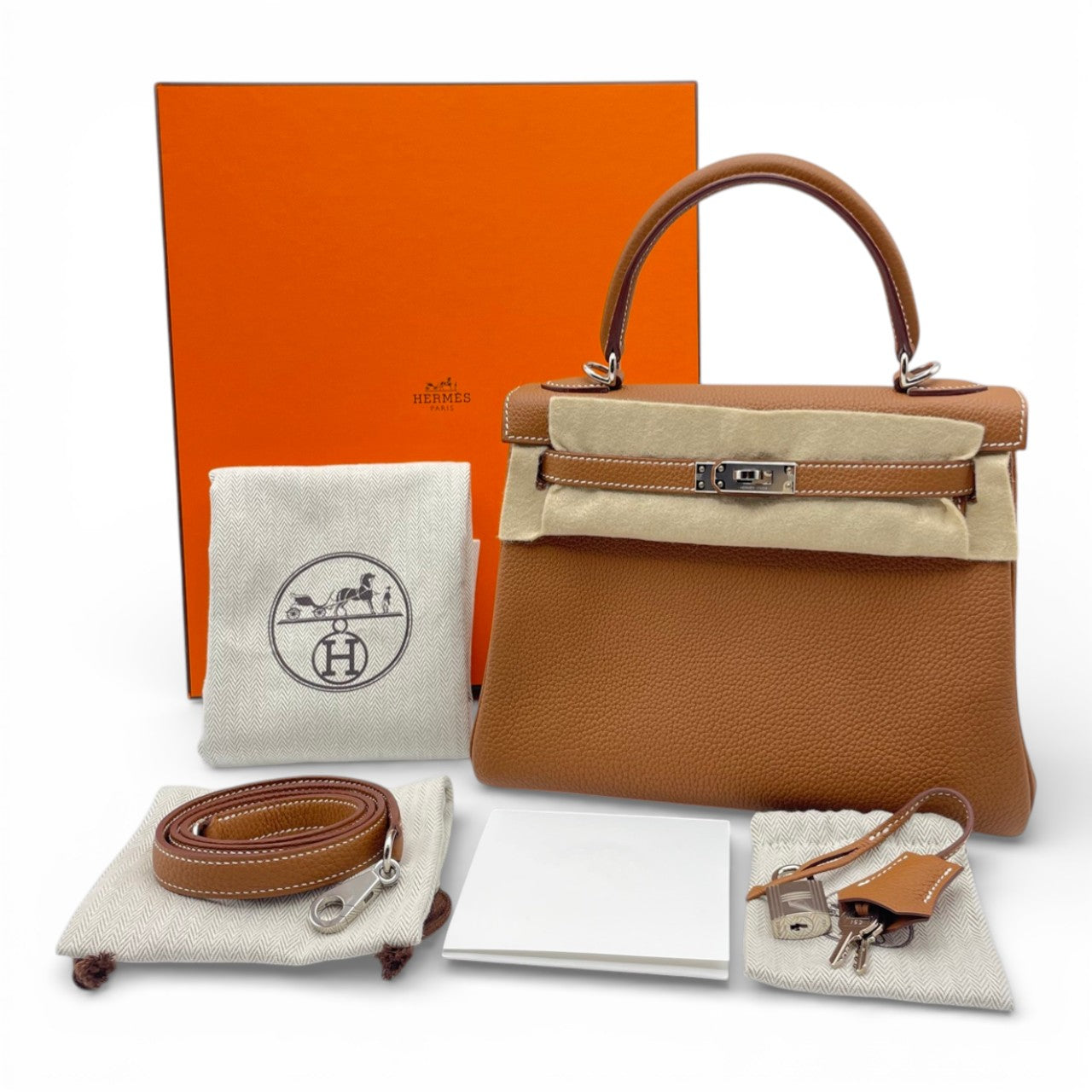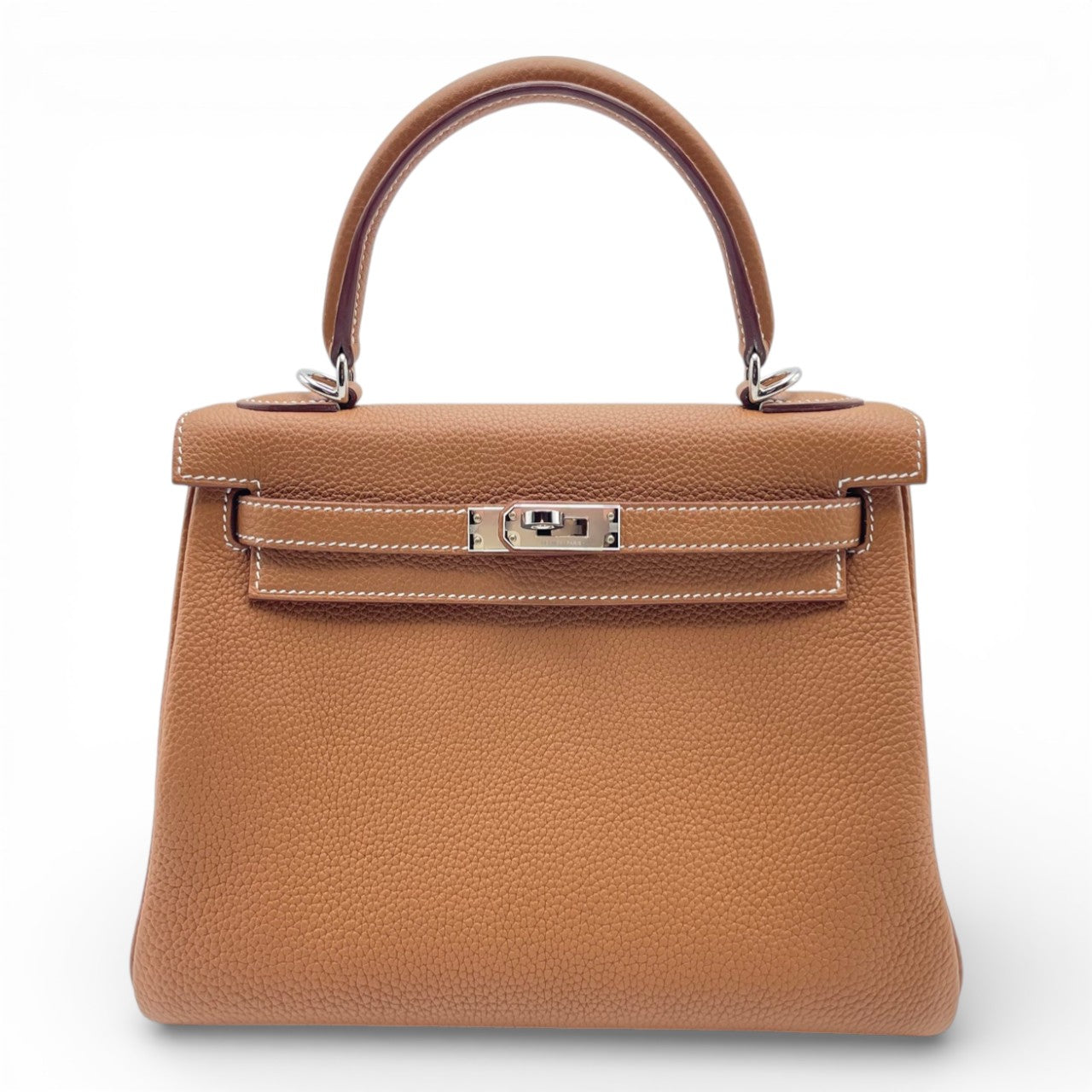 エルメスを代表するアイコンバッグ「ケリー」。上質なトゴ素材に気品あふれるゴールドカラーが合わさり、知的でエレガントな佇まいを演出します。25サイズはフォーマルから日常使いまで幅広く対応できる絶妙なバランスで、ミニマルながら必要なものをしっかり収納可能。シルバー金具とのコントラストも美しく、装いを選ばず一生もののパートナーとして寄り添うタイムレスな名品です。ワンランク上の自分を求める方にふさわしい一本です。