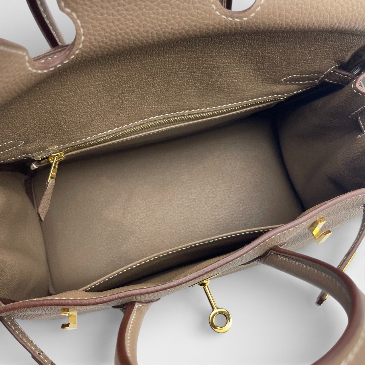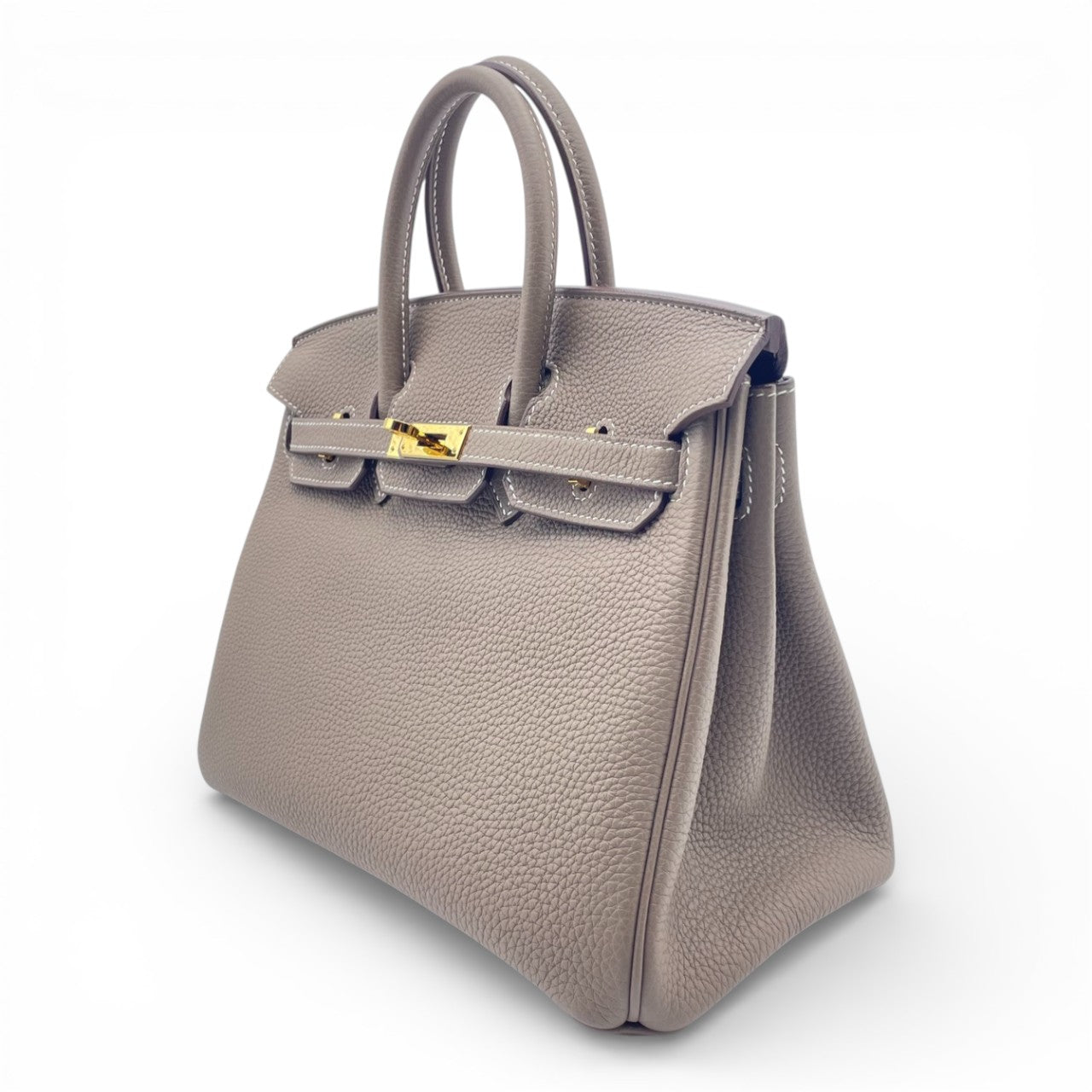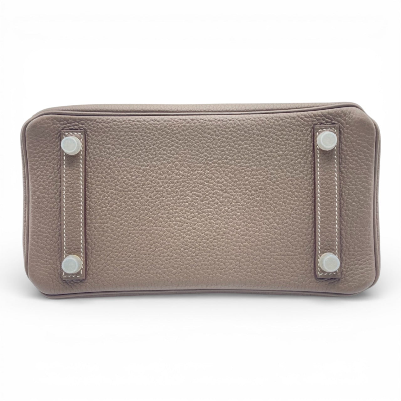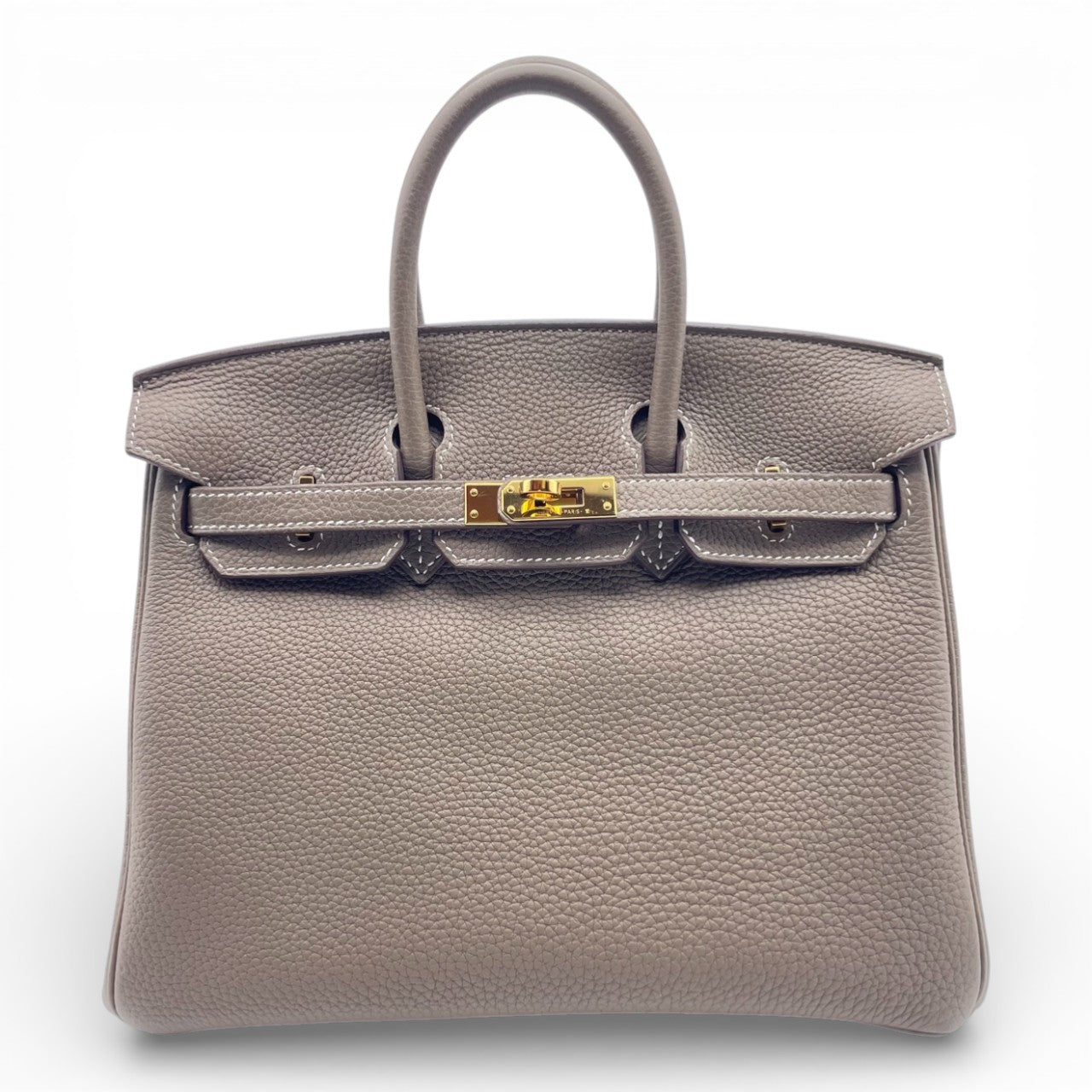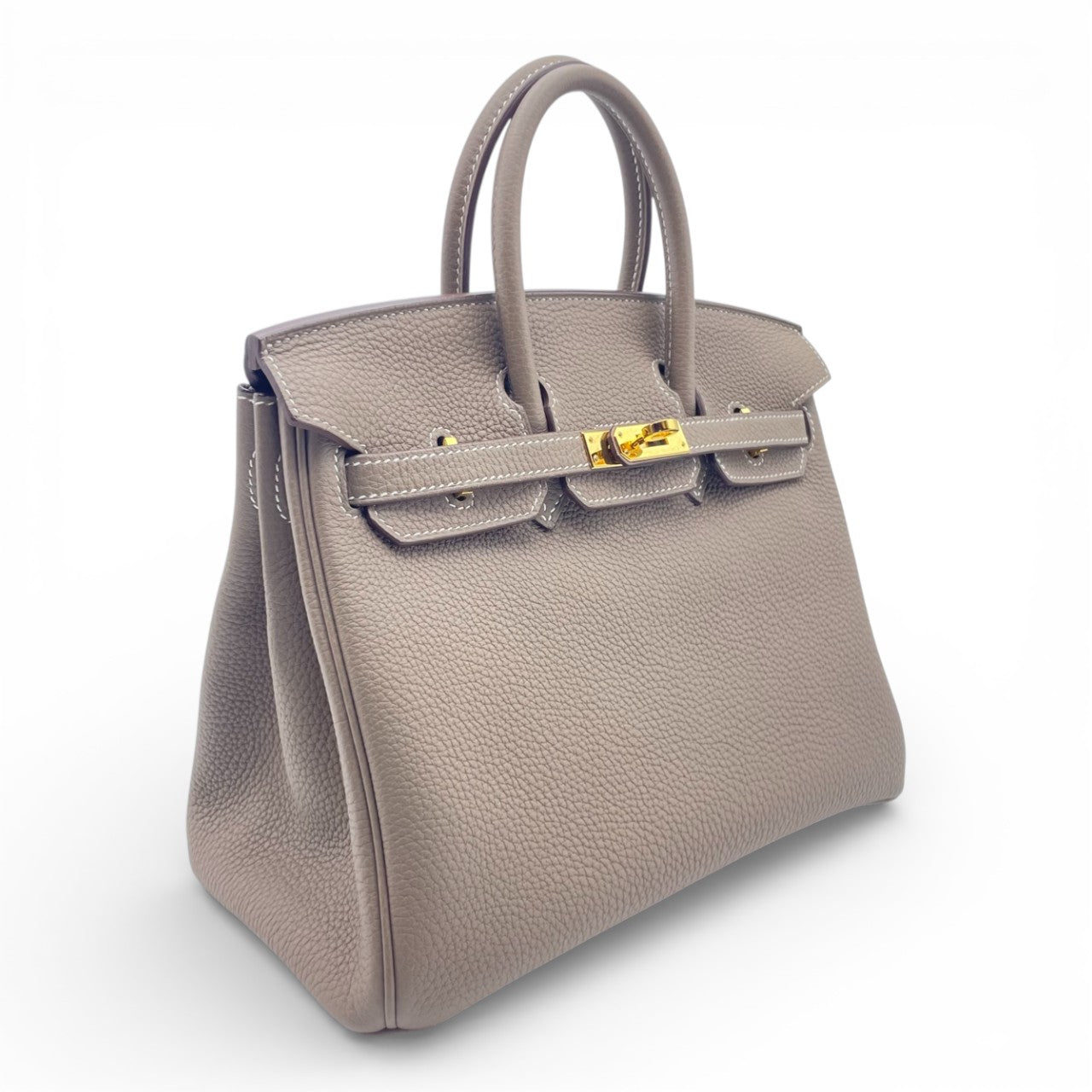 エルメスを代表するアイコンバッグ「バーキン」は、ラグジュアリーと実用性を兼ね備えた一生物の逸品です。上質なトゴレザーならではの程よいハリと柔らかさがあり、傷が目立ちにくくデイリーにもお使いいただきやすい点が魅力。グレージュ系のエトゥープカラーは、どんなスタイルにも馴染み、フォーマルからカジュアルまで幅広く活躍します。コンパクトな25サイズは、女性らしいバランスで手元を華奢に見せてくれる特別な存在です。