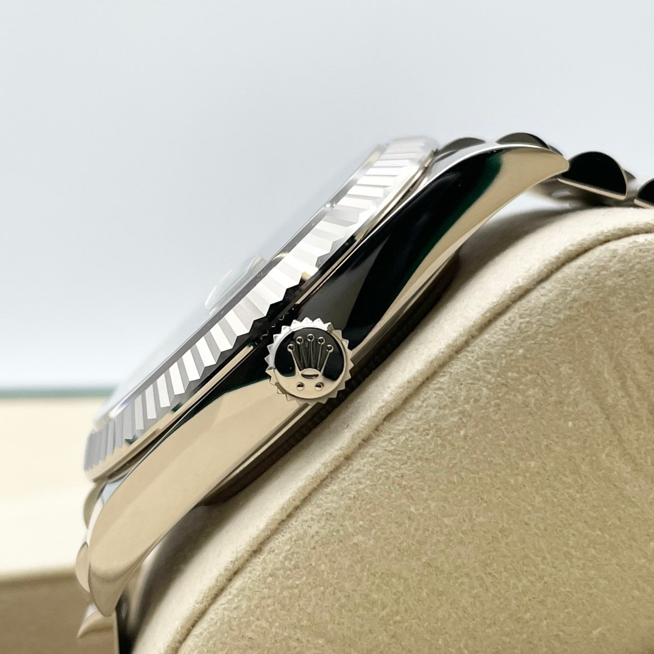 ロレックスを代表する最上級ドレスウォッチ「デイデイト 40」。重厚感のあるホワイトゴールドケースに、深みのあるグリーン文字盤が知的な華やかさを添え、ビジネスシーンからフォーマルまで手元をエレガントに演出します。ケース径40mmは男性には貫禄を、女性にはあえての“オーバーサイズ”としてモードな印象を与え、ジェンダーレスにお楽しみいただけるバランスです。成功の証として、また一生もののご褒美ウォッチとしてふさわしい一本です。