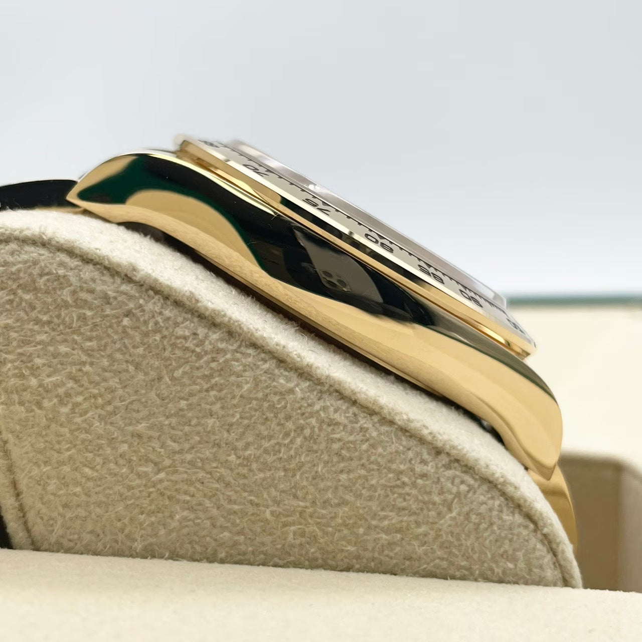 ロレックススポーツモデルの頂点に立つデイトナ126508。重厚なイエローゴールドケースに、スポーティーなインテンスブラックと上品なシャンパンカラーのコンビネーションダイヤルが映える一本です。ブラックが引き締め役となり、ゴールドの輝きを一層ラグジュアリーに引き立てる絶妙なデザイン。資産性・ステータス性ともに高く、一本で「一生もの」としてお楽しみいただける王道デイトナです。