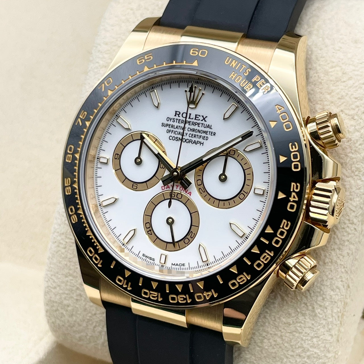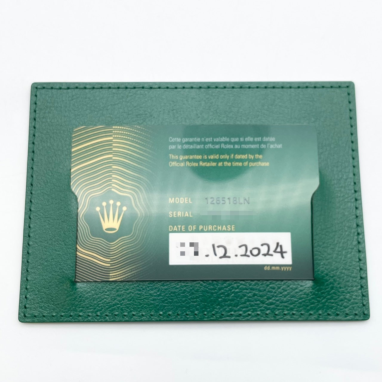 圧倒的な人気を誇る「コスモグラフ デイトナ」126518LN。スポーティーなブラックセラミックベゼルに、重厚感あるイエローゴールドケースを組み合わせた、ラグジュアリースポーツの完成形ともいえる一本です。シャープなブラックインダイヤルが映えるホワイトダイヤルは視認性も抜群で、上品に腕元を演出します。現行世代ならではの洗練されたフォルムと安心感のある最新ムーブメントを搭載した、高い評価を受けるモデルです。中古美品個体のためコンディションも良好で、お探しの方にはぜひ手に取っていただきたい一本です。