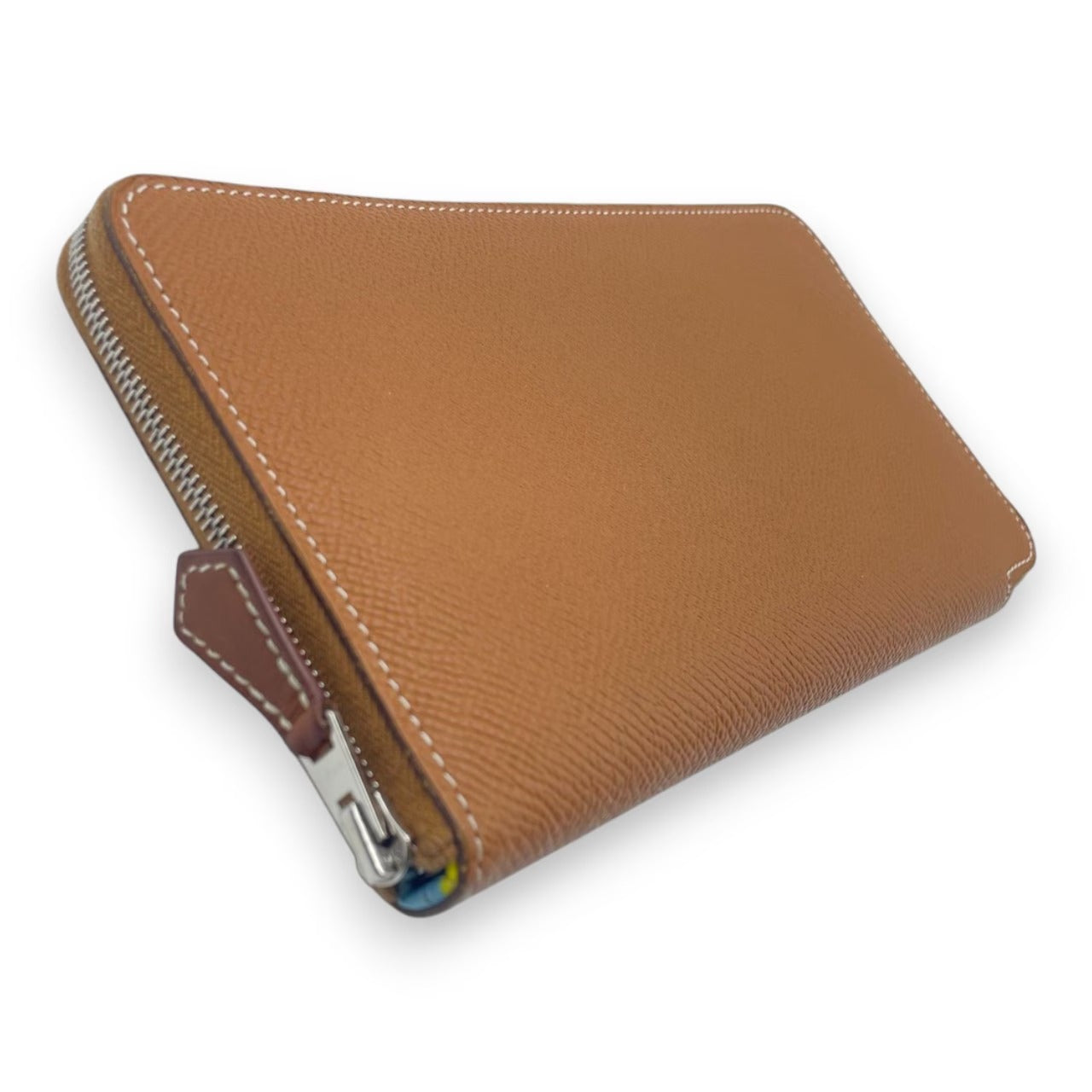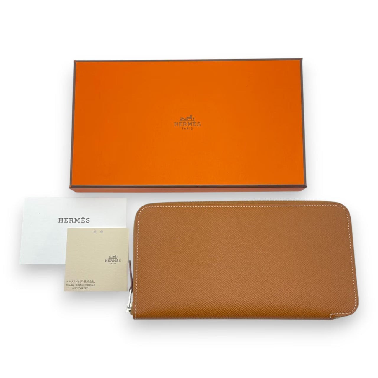 エルメスの人気ロングウォレット「アザップロング シルクイン」。上質なエプソンレザーに、エルメスらしい温かみのあるゴールド(ブラウン/茶系)のカラーがエレガントな一点です。開いた瞬間にのぞく、遊び心あふれるシルクインの内側が、大人の女性の心をくすぐります。カードスロットやファスナー付きコインポケットなど収納力も抜群で、日常からご旅行まで幅広いシーンで活躍します。
