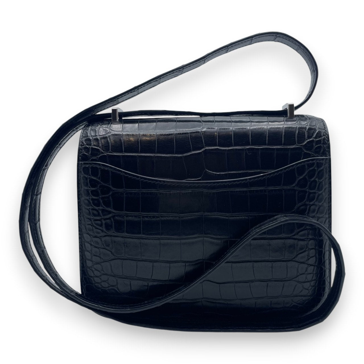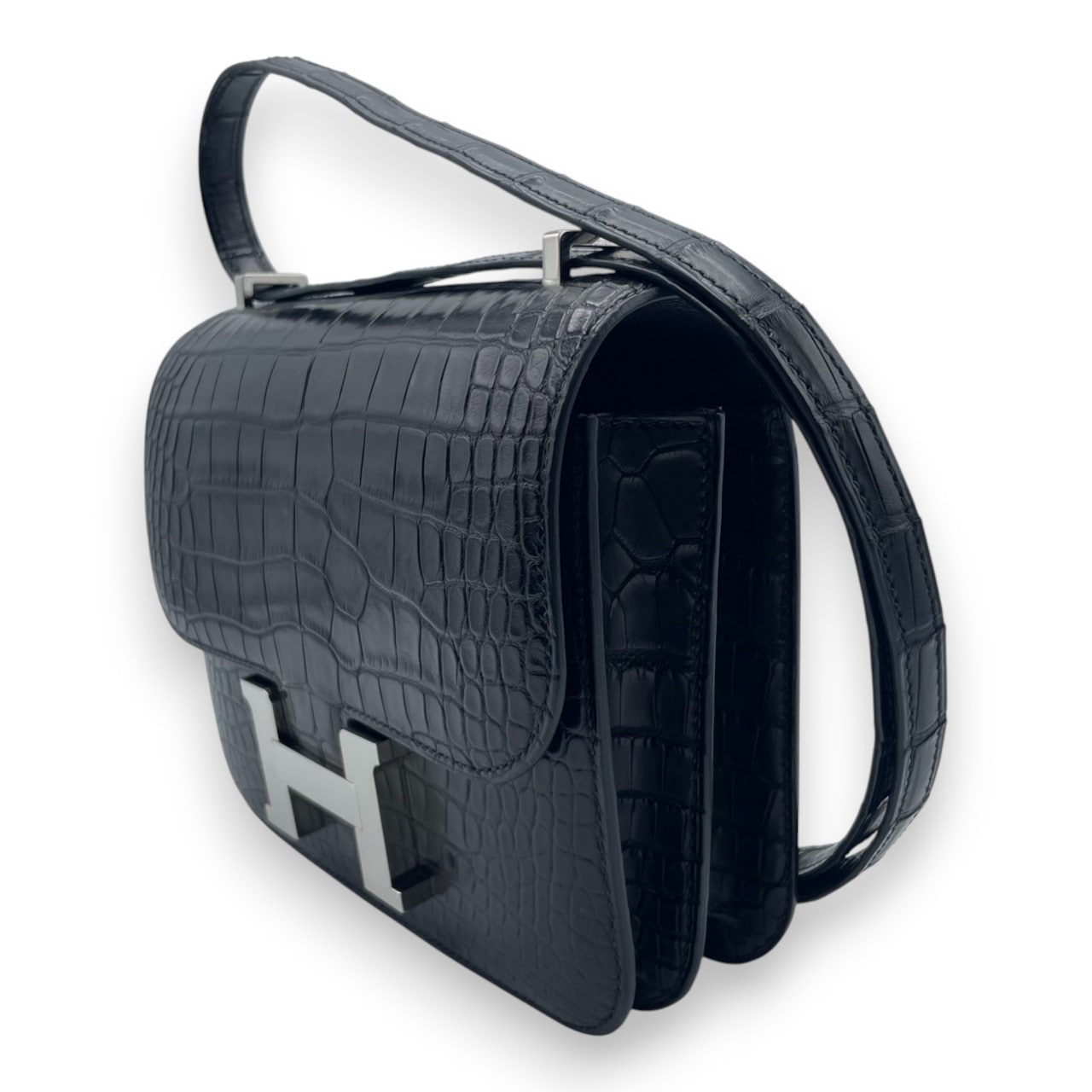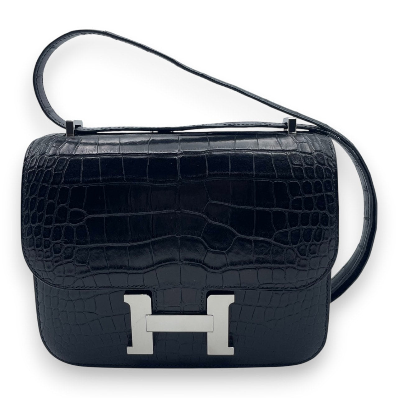 エルメスを代表するアイコンバッグ「コンスタンス」。横幅18cmのサイズは必要なものをスマートに収納でき、ドレスアップからデイリーまで幅広く活躍する人気のサイズです。アリゲーターマットならではの質感と、ノワールの気品あるカラーが相まって、装いを一段と格上げしてくれます。エルメスならではのエレガンスと希少素材の存在感を、日常で贅沢にお楽しみいただけるお品です。
