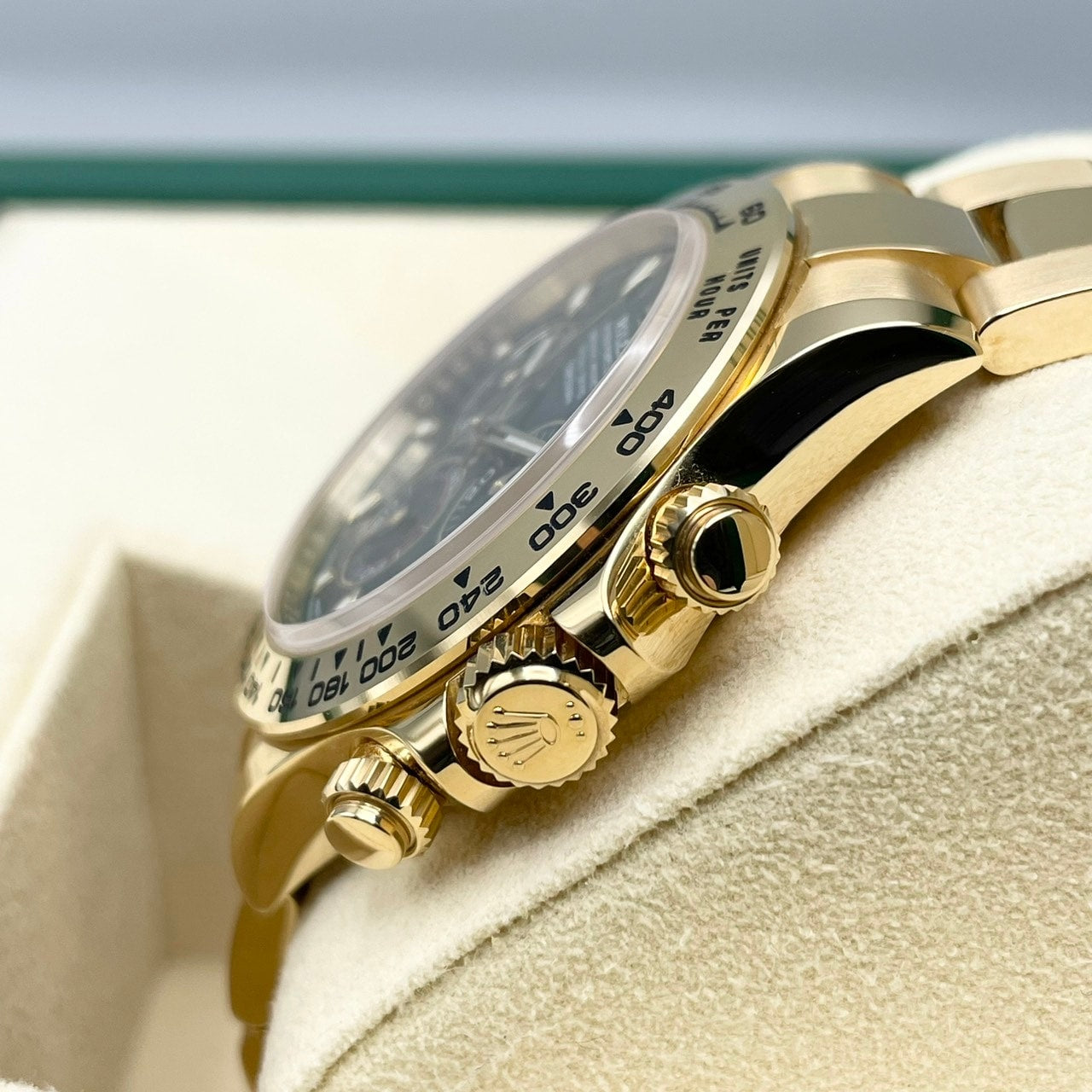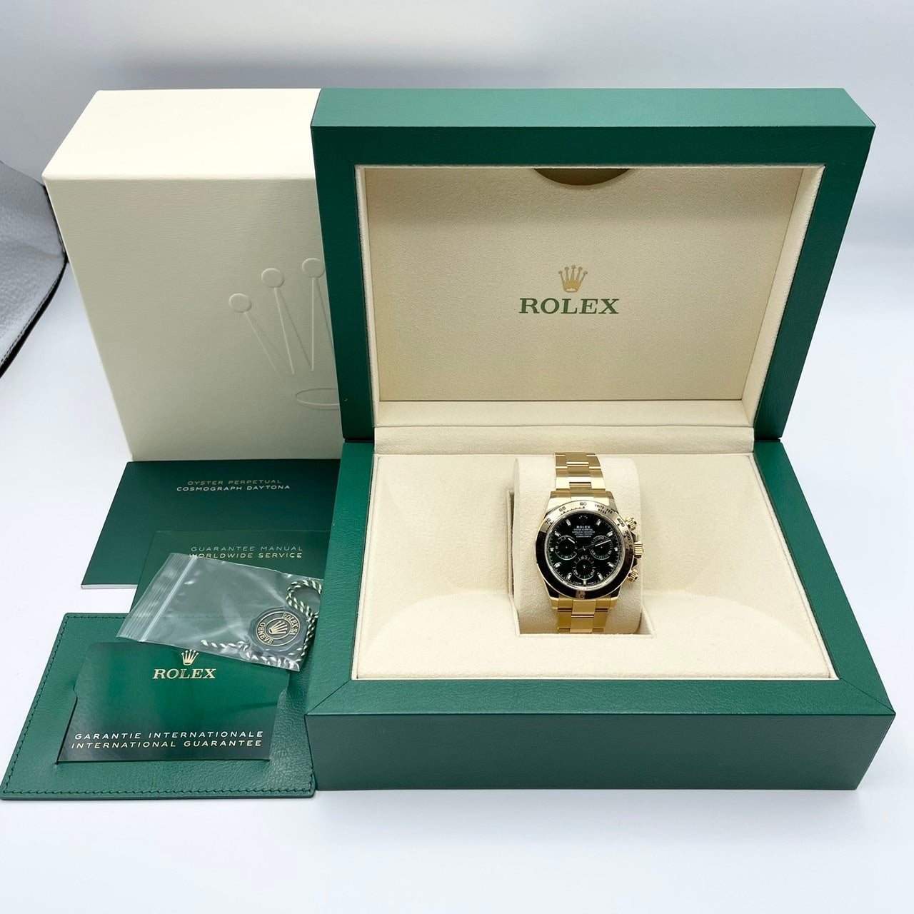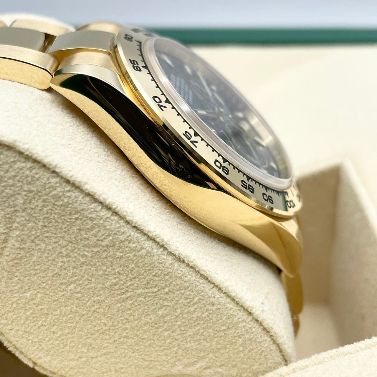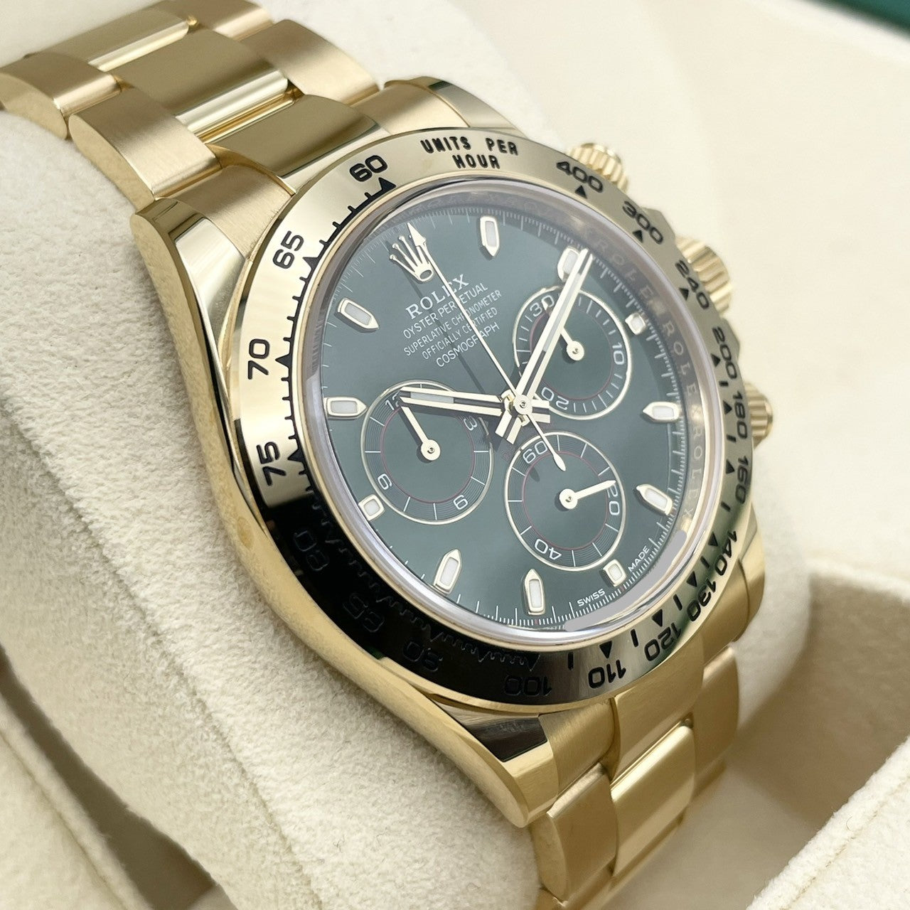 这款手表具有独特的豪华感觉,并结合了黄金身体和绿色表盘。